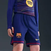 Het FC Barcelona thuistenue 2023-2024 wordt compleet gemaakt door een blauw voetbalbroekje, waarop ook de logo's van Nike en de club staan. De kousen zijn rood en bevatten een design van verticale strepen in het blauw.
