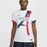 Het Paris Saint Germain uitshirt is overwegend wit en wordt gekenmerkt door het horizontale blok op de borst. Dit blok is in stijl van de clubkleuren van ''PSG''. De rechterkant is rood en de andere kant is blauw. Middels een prisma effect lopen deze kleuren in elkaar over, zoals de iconische lichten van de stad Parijs overgaan in de sterrenhemel. In het vlak is het logo van hoofdsponsor Qatar Airways in het wit verwerkt. De band aan de onderkant van de mouwen is blauw en hetzelfde geldt voor de swoosh van Nike op de rechterborst en het logo van GOAT op de linkermouw. De linkerborst bevat traditiegetrouw het clublogo van de Franse kampioen. Het Paris Saint Germain uitshirt heeft verder alle kenmerken van het nieuwe Nike template. Het voetbalshirt bevat een ronde hals met daaronder een ronding. De achterkant van het voetbalshirt bevat ook een donkerblauw vlak en daaronder is een graphic verwerkt in de kleuren van de Franse vlag: blauw/wit/rood. Het Paris Saint Germain uittenue 2023-2024 wordt compleet gemaakt door een volledig wit voetbalbroekje. Op de voetbalbroekjes staan ook de logo's van Nike en de club. De kousen zijn wit en bevatten op het midden een donkerblauwe swoosh.