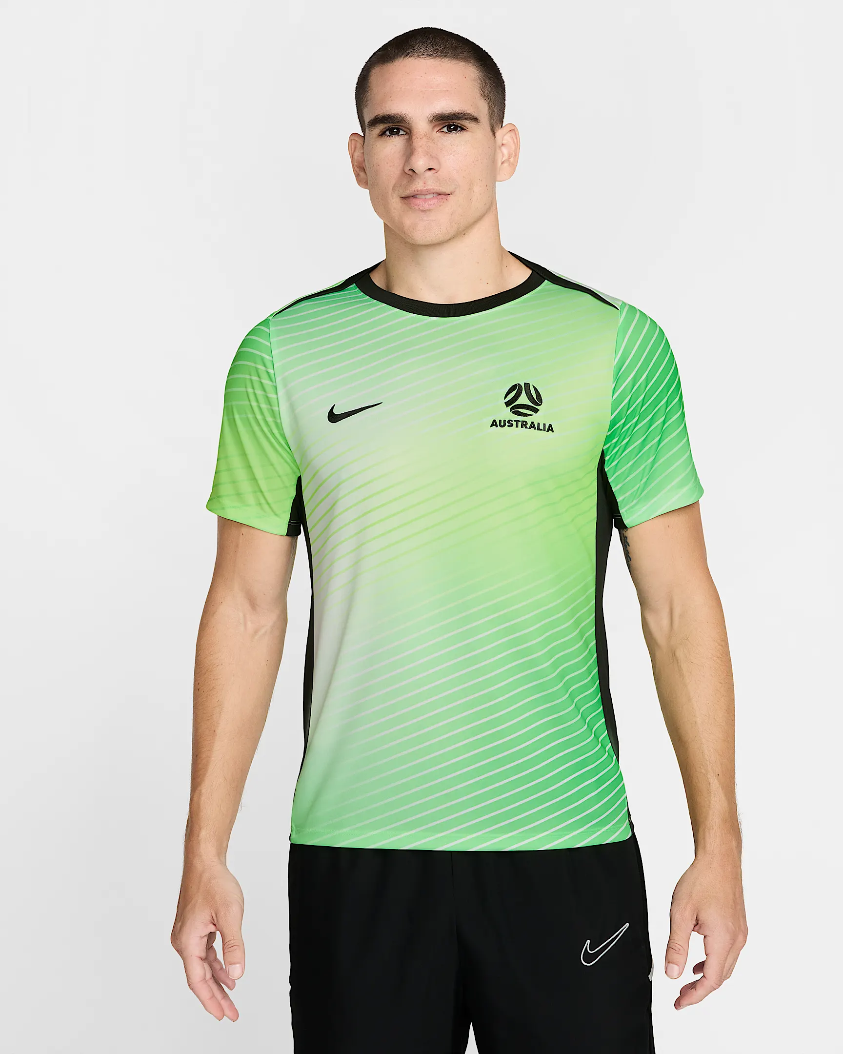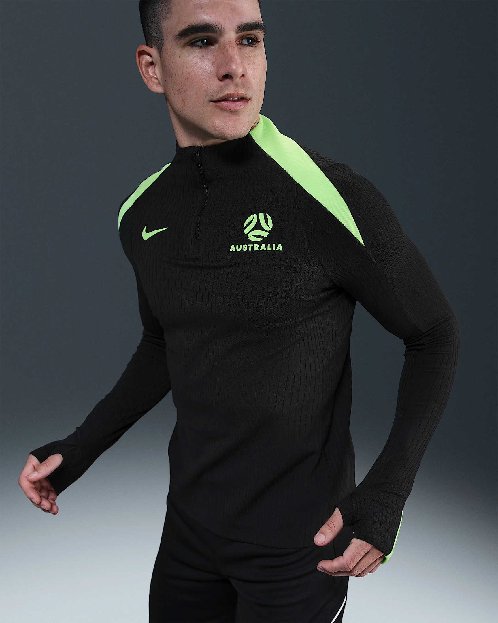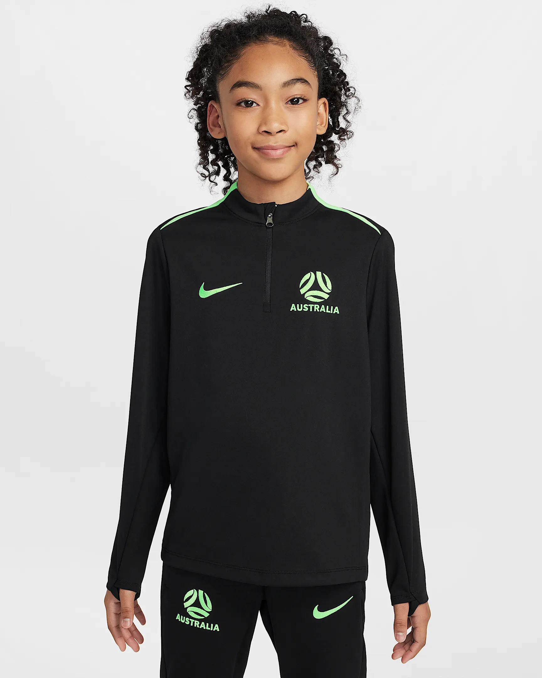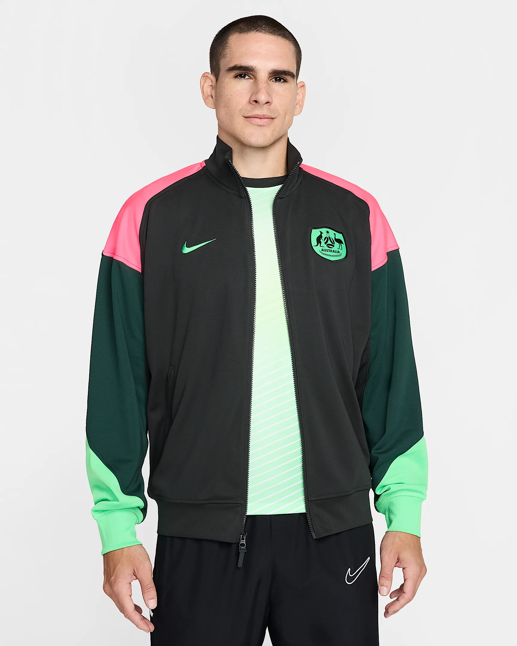 Het Nike Australië anthem trainingsjack 2025-2026 is dit jaar donkergroen en wordt gekenmerkt door de fel groene en roze retro kleurblokken op de mouwen en achterkant. Dit design is geïnspireerd door de trainingsjacks van de jaren '90. Op de borst van het trainingsjack staan de logo's van Nike en Australië. Het Australië trainingsjack is uitgerust met een doorlopende rits en bevat een hoge hals. Bovendien is het anthem trainingsjack uitgerust met zakken met ritsen. De geribte boorden aan de onderkant en aan de onderkant van de mouwen zorgen ervoor dat het jack perfect om het lichaam valt. Dit anthem jack bestaat voor 100% uit polyester en is uitgerust met de Nike Dri-Fit technologie, welke zorgt voor de afvoer van vocht en voor ventilatie. Het trainingsjack heeft een normale pasvorm.
