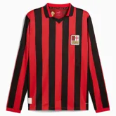 Het AC Milan jubileum voetbalshirt wordt gekenmerkt door de brede rode en zwarte banen, die voor het eerst op het voetbalshirt verschenen tijdens de jaren ’50 van de vorige eeuw en sindsdien synoniem staan voor de indrukwekkende internationale prijzenkast, die vooral sinds de jaren ’80 uitgebreid is! Zoals het een retro shirt betaamd bevat het AC Milan 125 anniversary voetbalshirt een klassieke retro polokraag in de clubkleuren. Een ander detail van het shirt is de badge op de linkerborst. Dit betreft het allereerste AC Milan logo, welke werd vastgelegd bij de oprichting in 1899. Dit logo staat inmiddels symbool voor de visie van oprichter Herbert Kilpin, die als Engelsman zijn culturele erfgoed overbracht naar Italië door een combinatie tussen een voetbal- en cricketclub op te richten. Een ander detail bevindt zich aan de binnenkant van de hals. Hier prijkt een graphic van de ‘’Diavoletto’’. Deze kleine duivel werd door de supporters tot leven gebracht in de jaren ’80 en is nog steeds één van de belangrijkste symbolen van de club. De binnenkant van de hals bevat ook het getal 125 en de naam van de club in het goud, verwijzend naar het jubileum. In de nek op de achterkant van het shirt staat subtiel het moderne AC Milan logo en op de mouwen staat het logo van Puma. Het tenue wordt compleet gemaakt door een wit voetbalbroekje en zwarte sokken.