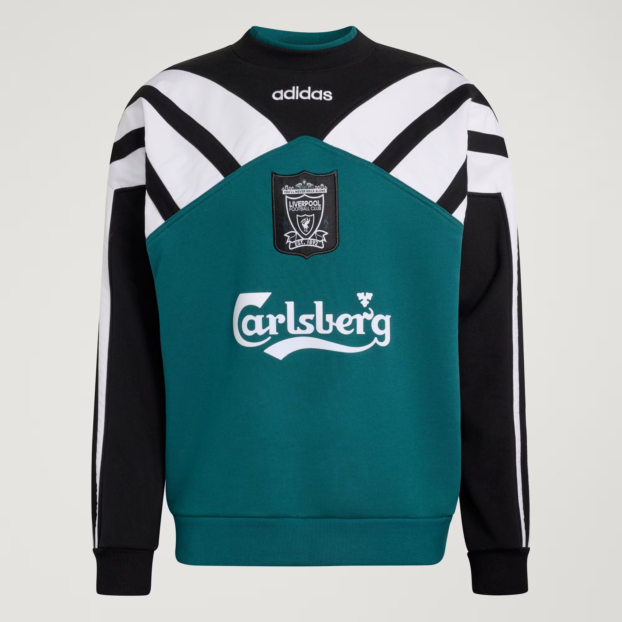 Het design van het Liverpool FC uitshirt 1995-1996 combineert een opvallende kleurencombinatie van groen, zwart en wit, een palet dat inmiddels onlosmakelijk verbonden is met het Liverpool van de jaren negentig. Het shirt valt op door de vier vlakken op de body. Het vlak rechtsboven en linksonder is donkergroen (EQT Green), terwijl de contrasterende vlakken wit zijn. In het design is daarnaast een patroon van repeterende strepen verwerkt, geïnspireerd door de kenmerkende adidas-strepen, die in het zwart op de schouders zijn geplaatst. De remake bevat ook verschillende authentieke details uit die periode. Zo is het originele Liverpool FC clublogo uit het seizoen 1995-1996 opnieuw gebruikt, prijkt het klassieke Carlsberg-logo op het midden van het shirt en staat het adidas-logo prominent op de borst. Samen zorgen deze elementen voor een typisch jaren negentig uitstraling die bij veel supporters nostalgische herinneringen oproept.