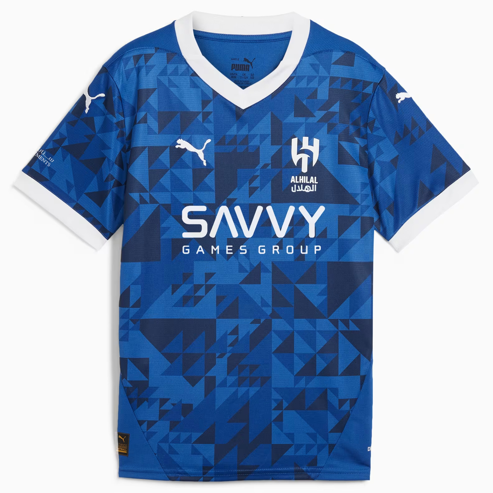 Het Al-Hilal thuisshirt 2024-2025 heeft een donkerdere tint blauw dan vorig seizoen en bevat ook dit jaar weer een speciaal patroon. Dit jaar betreft dat een patroon van ruiten in verschillende tinten blauw en in verschillende groottes. Het thuisshirt heeft een witte v-hals en ook de band aan de onderkant van de mouwen is wit. Hetzelfde geldt voor alle logo’s op de Al-Hilal voetbalshirts. De rechterborst en de mouwen zijn uitgerust met het logo van Puma en de linkerborst bevat het clublogo. Hoofdsponsor Savvy Games Group versiert het midden van de Al-Hilal voetbalshirts 2024-2025. Op de achterzijde van de voetbalshirts staan de logo’s van Kingdom Holding Company en Seven. Het Al-Hilal thuistenue 2024-2025 wordt compleet gemaakt door een blauw short en blauwe sokken met witte accenten.