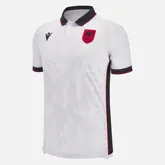 Het Albanië uitshirt 2023-2024 heeft hetzelfde template als het thuisshirt. Dit voetbalshirt is wit en bevat dezelfde all-over print als het thuisshirt. De polokraag is zwart met een subtiele rode lijn en hetzelfde geldt voor de biesjes en de band aan de onderkant van de mouwen. De logo's van Macron en de voetbalbond staan op dezelfde plek als op het thuisshirt en hetzelfde geldt voor alle details. Het uittenue wordt compleet gemaakt door een wit voetbalbroekje met zwarte touwtjes en een zwarte taping aan de zijkanten. De kousen van het uittenue zijn wit met een dunne rode lijn aan de bovenkant.