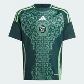 Het Algerije uitshirt 2024-2025 bevat hetzelfde patroon als het thuisshirt, alleen is dit patroon wat beter zichtbaar, omdat het een contrasterende kleur heeft. Bovendien is het patroon niet in het materiaal verwerkt, maar staat het als print op het Algerije uitshirt. Het Algerije uitshirt is donkergroen met een lichtgroen patroon. Dit is ook de kleur van de golf op de zijkanten, de adidas strepen en de band in de ronde hals. Op het uitshirt staan de logo’s van de voetbalbond en adidas centraal op de borst. Het adidas logo op dit voetbalshirt is wit. Het uittenue wordt compleet gemaakt door een donkergroen short met aan de zijkanten een lichtgroene golf. Dit zijn ook de kleuren van de sokken.
