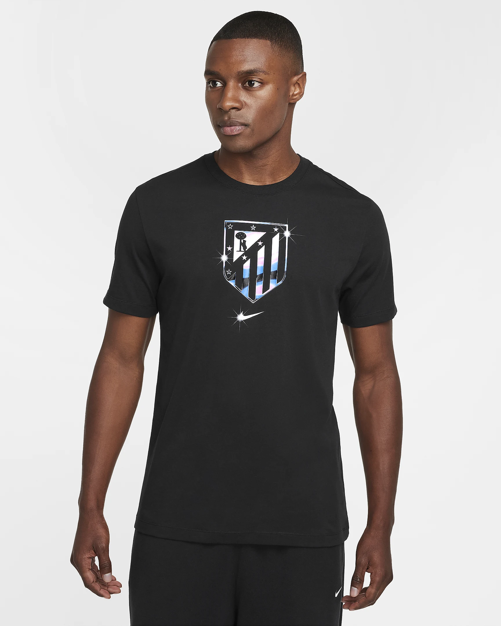 Het Nike Atlético Madrid uitshirt 2023-2024 heeft ook het half-om-half design. De rechterkant van het voetbalshirt is blauw en de linkerkant is wit. De mouwen van het voetbalshirt zijn blauw en dit gedeelte is gescheiden middels een ronding, welke kenmerkend is voor het Nike Strike template. De mouwen worden afgesloten door een witte band en ook de ronde hals is wit. Op de rechterborst prijkt het logo van Nike in het wit en de linkerborst bevat niet het Atlético Madrid logo, maar het logo van Athletic Club Sucursal de Madrid, de voorloper van Atlético Madrid.Dit logo wordt gekenmerkt door een riem rondom een voetbal, waarom de initialen van Athletic Club in elkaar verstrengeld zijn. De binnenkant van de hals bevat nog een verwijzing naar het 120 jarig bestaan van de club. Hier staat de tekst: ''Desde 1903 – 120 – Ahoe de Atleti''. De sponsorlogo's staan op de bekende plekken. Op het midden van het tenue staat hoofdsponsor Whalefin, de rechtermouw bevat het logo van subsponsor Hyundai en op de achterzijde staat het logo van Ria Money Transfer. Het Atletico Madrid uittenue wordt compleet gemaakt door een blauw voetbalbroekje, waarop ook de logo's van de club en Nike staan. De kousen zijn wit met aan de bovenkant een blauwe band.
