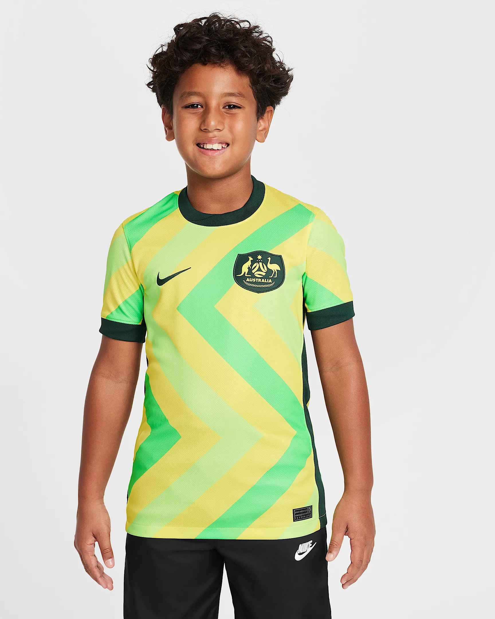 De nieuwe collectie is een ode aan het voetbal ''Down Under''. De collectie is een krachtig statement van progressie, eenheid en uitmuntendheid. Bij het ontwerp van de tenues heeft Aboriginal kunstenaar Reko Rennie de diepe verbinding met het voetbal als uitgangspunt genomen, wat heeft geleid tot een geheel nieuwe interpretatie van de traditionele kleuren van het land: groen en goud. Het Australië thuisshirt 2025-2026 is een ode aan de diverse volkeren en culturen van de Aboriginals en de Straat Torreseilanders. Het shirt is overwegend geel en wordt gekenmerkt door de groene zigzagbanen. Op het shirt bevinden zich zowel lichtgroene als felgroene banen. Deze banen symboliseren het levendige multiculturalisme van het Austrailë. De ronde hals, de band aan de zijkanten en de band aan de onderkant van de mouwen zijn donkergroen. Een speciaal detail bevindt zich aan de binnenkant van de hals van beide voetbalshirts. Hier prijkt namelijk de iconische Aboriginals vlag. Op de rechterborst prijkt de swoosh van Nike in het donkergroen en de linkerborst bevat de badge van de Australische voetbalbond, de Football Australia. Het thuistenue wordt compleet gemaakt door een donkergroen voetbalbroekje. De sokken van het tenue zijn wit met aan de bovenkant een brede donkergroene band en daaronder een fel groene lijn.