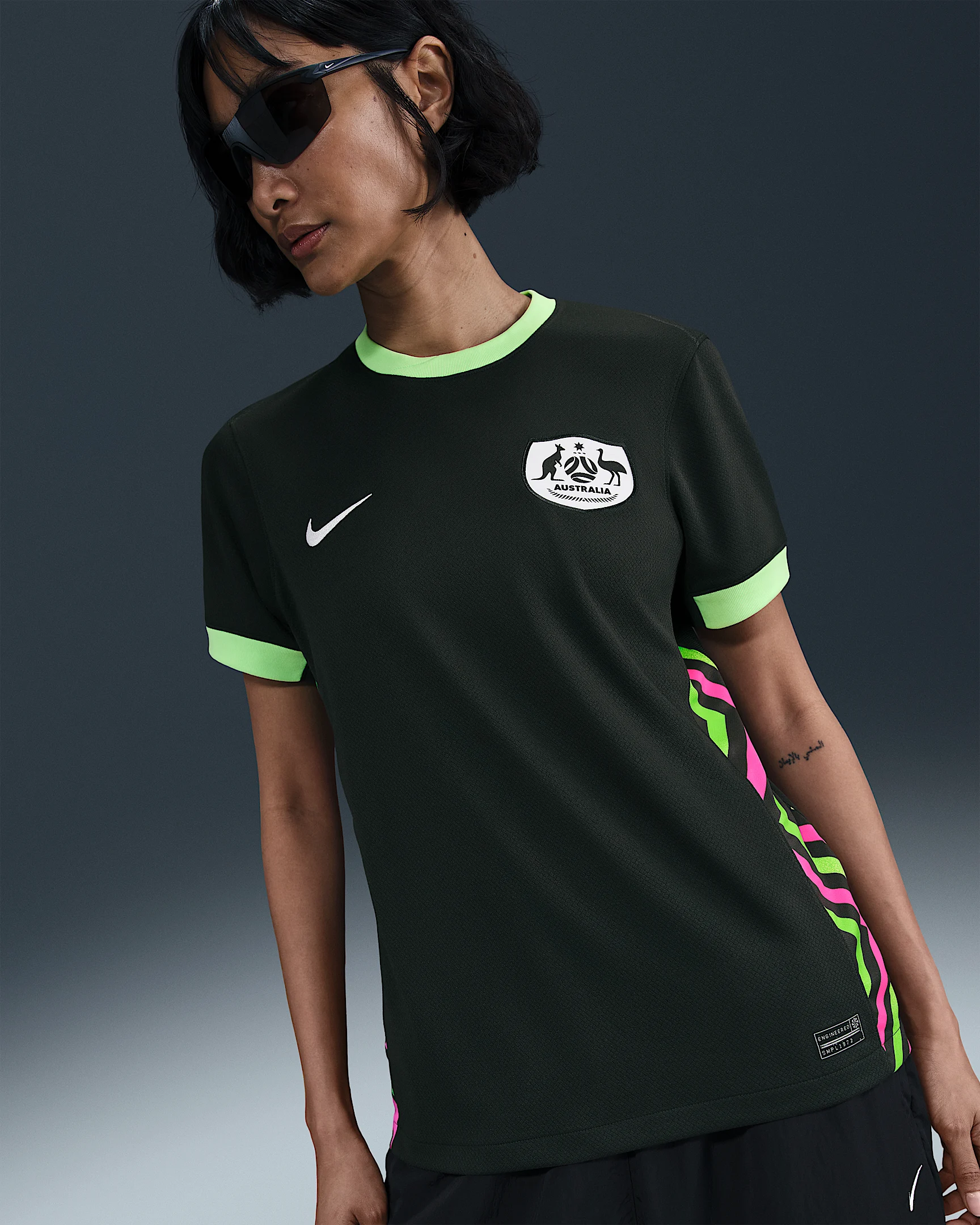 Het Australië uitshirt 2025-2026 is donkergroen en wordt met name gekenmerkt door de zigzagbanen op de zijkanten in het roze en fel groen. Ook deze banen zijn geïnspireerd door cultuur van alle ''First Nations'', de inheemse volkeren en met name die van de Aboriginals in Australië. De ronde hals en de band aan de onderkant van de mouwen van het uitshirt zijn felgroen, terwijl de logo's op de borst wit zijn. Ook de binnenkant van de hals van het Australië uitshirt is uitgerust met de vlag van de Aboriginals. Het uittenue wordt compleet gemaakt door een donkergroen short en donkergroene sokken met felle accenten.