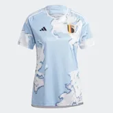 Het België vrouwen uitshirt 2023-2024 betreft een custom made voetbalshirt dat alleen door het vrouwenteam gedragen wordt en niet door het mannenteam. Het voetbalshirt heeft hetzelfde thema als de andere adidas voetbalshirts van de vrouwenteams. Dat thema is de natuur en het België dames uitshirt is dat de lucht en de wolken. Het voetbalshirt bevat namelijk een all-over print van de lucht en wolken, om te illustreren dat de ontwikkeling van het vrouwenteam en het vrouwenvoetbal in België geen grenzen kent: The sky is the limit''. De adidas strepen op de schouders zijn wit en het adidas logo op de rechterborst is zwart. Dit betreft het nieuwe adidas performance logo. Dit logo wordt ook wel het 3BAR logo genoemd, omdat het alleen drie diagonale blokken bevat, en wordt door adidas op alle nieuwe voetbalshirts gebruikt vanaf dit seizoen. Op de andere borst prijkt het logo van de Koninklijke Belgische voetbalbond (KBVB). Het voetbalshirt is verder uitgerust met een ronde hals. Het tenue wordt compleet gemaakt door een wit voetbalbroekje met aan weerszijden lichtblauwe adidas strepen. De kousen zijn lichtblauw met aan de bovenkant ook adidas strepen in een net iets andere tint lichtblauw.