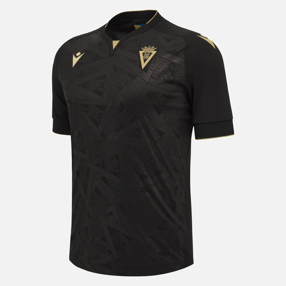 Het Cadiz uitshirt 2023-2024 is zwart en bevat een all-over print van het clublogo in het zwart. Het clublogo wordt gekenmerkt door een driehoekig schild met daarin een afbeelding van Hercules, geflankeerd door twee leeuwen en twee pilaren op de achtergrond. Deze logo's zijn in verschillende standen op het voetbalshirt verwerkt. Het uitshirt bevat bovendien gouden accenten. Alle logo's op het voetbalshirt zijn namelijk goud en hetzelfde geldt voor de driehoek oner de ronde hals en de subtiele lijn in de kraag. Alle logo's staan op dezelfde plek als op het thuisshirt. De binnenkant van het uitshirt bevat ook een label in de clubkleuren van Cadiz. Het Cadiz uittenue wordt compleet gemaakt door een zwart voetbalbroekje en zwarte kousen met gouden logo's.