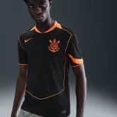 Het Corinthians 3e shirt 2025-2026 heeft, evenals alle andere 3e shirts van Nike, het Total90 template. De 3e shirts van FC Barcelona, Paris Saint Germain, Inter Milan, Chelsea, Tottenham Hotspur en Atlético Madrid hebben namelijk ook dit template. Het template is geïnspireerd door het standaard design dat Nike in het seizoen 2004-2005 voor alle voetbalshirts gebruikte. Hiermee slaan de Braziliaanse club en kledingsponsor Nike een brug tussen het heden en verleden! Qua kleuren had het Corinthians 3e shirt zo maar door kunnen gaan voor een Nederlands Elftal voetbalshirt. Het shirt is namelijk zwart met oranje accenten. De oranje accenten komen terug in de naden, die langs de zijkanten richting de gevouwen v-hals lopen. De kraag is ook oranje en hetzelfde geldt voor de naden aan de onderkant van de mouwen en alle logo’s op het shirt. De swoosh van Nike op de rechterborst is namelijk oranje en hetzelfde geldt voor de badge van de club. Onder het logo van Nike prijkt het borstnummer in de iconische Total90 cirkel. Het Corinthians derde tenue wordt compleet gemaakt door een zwart voetbalbroekje met aan weerszijden een oranje band. De sokken van het tenue zijn zwart met aan de bovenkant een oranje vlak.