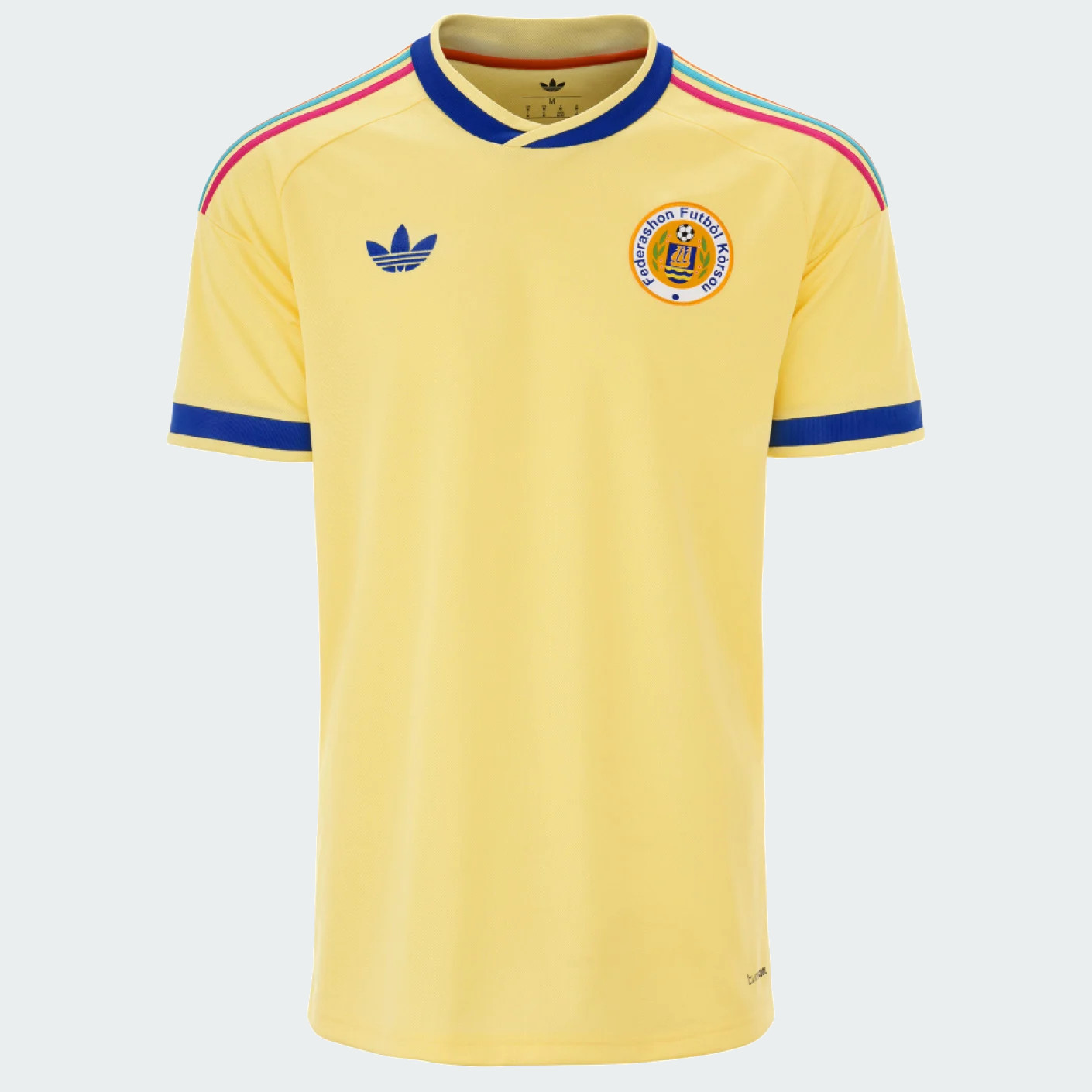 Het pastelgele Curaçao uitshirt 2026-2027 is geïnspireerd door de iconische, kleurrijke gevels van Willemstad, die op de werelderfgoedlijst van UNESCO staan. De felgekleurde huisjes staan symbool voor de rijke historie en cultuur van Curaçao, waarin Europese invloeden samenkomen met Caribische charme. Hun unieke kleurenpalet en karakteristieke bouwstijl maken ze tot een herkenbaar en geliefd beeld van het eiland. De levendige kleuren van de adidas strepen op de schouders verwijzen naar de diverse architectuur langs de Handelskade en geven het shirt een unieke, tropische uitstraling. Deze strepen zijn oranje, turquoise en roze, terwijl de overlappende v-hals en de mouwboorden een donkerblauwe band bevatten. Op de rechterborst prijkt niet het logo van adidas, maar het logo van adidas Originals. Het Duitse sportmerk gebruikt na 26 jaar weer de trefoil op alle uitshirts. De linkerborst is uitgerust met het logo van de nationale voetbalbond, de Federashon Futbòl Kòrsou (FFK). Een laatste detail staat in de nek op de achterzijde. Hier prijkt de naam van het land in dezelfde kleuren als de adidas strepen op de schouders.
