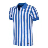 Het SPAL retro voetbalshirts heeft de iconische lichtblauwe en witte verticale banen en wordt verder gekenmerkt door de open hals en de gevouwen kraag in het lichtblauw. Dit is ook de kleur van de band aan de onderkant van de mouwen. Op de borst van het voetbalshirt staan geen logo's, omdat deze ook in de jaren '60 nog niet op de tenues stonden. De binnenkant van de hals van het SPAL retro voetbalshirt bevat wel een label met daarin de logo's van COPA en de club.