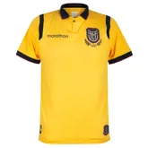 Het Ecuador uitshirt ter ere van het 100 jarig bestaan van de voetbalbond is geel met ter hoogte van de schouders een verticale donkerblauwe band. Ook dit shirt bevat een repeterende tone-on-tone print van de historische logo's van de voetbalbond. Het uitshirt heeft een navy blauwe kraag met een rode lijn, wat ook de kleurencombinatie is van de band aan de onderkant van de mouwen. Het uitshirt heeft dezelfde details als het thuisshirt. Deze details en de logo's staan op dezelfde plek als op het thuisshirt. Dit tenue wordt compleet gemaakt door een navy blauw short en gele sokken met navy blauwe accenten.
