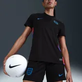 Het Engeland Euro 2025 vrouwen uitshirt is geïnspireerd door het onverschrokken optimisme en het leiderschap van zowel de huidige als vroegere Lionesses. Hierdoor heeft het shirt vooral een eigentijds design. Het Engeland vrouwen uitshirt 2025-2026 is overwegend zwart met kleurige details. Nooit eerder in de historie van het Engelse voetbalelftal was een voetbalshirt van een vertegenwoordigend elftal van Engeland zwart. Ook dit shirt bevat opvallende kleurblokken, maar dan op de zijkanten. Deze blokken doen denken aan het design van het Engeland uitshirt 2024-2025 en zijn lichtblauw, rood, zwart en roze. Ook deze blokken hebben een gradiënt effect. De details en logo’s op het Engeland uitshirt zijn lichtblauw. De logo’s van Nike en de FA staan op dezelfde plek als op het thuisshirt en de binnenkant van de ronde hals heeft dezelfde graphic als het thuisshirt. Dit tenue wordt compleet gemaakt door een zwart voetbalbroekje met aan weerszijden dezelfde kleurblokken als op het uitshirt. De sokken zijn overwegend zwart met in het lichtblauwe de swoosh en de letters ENG.