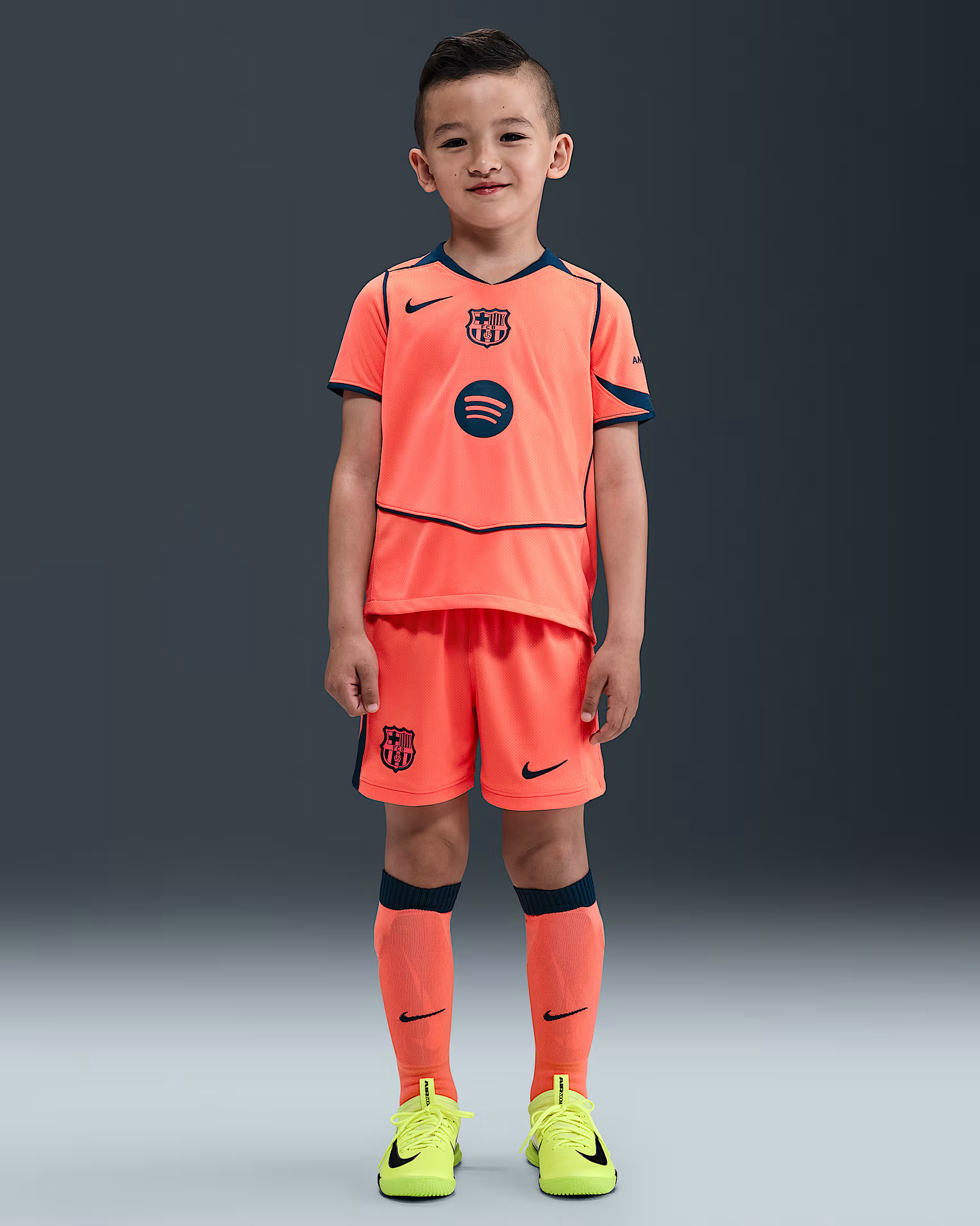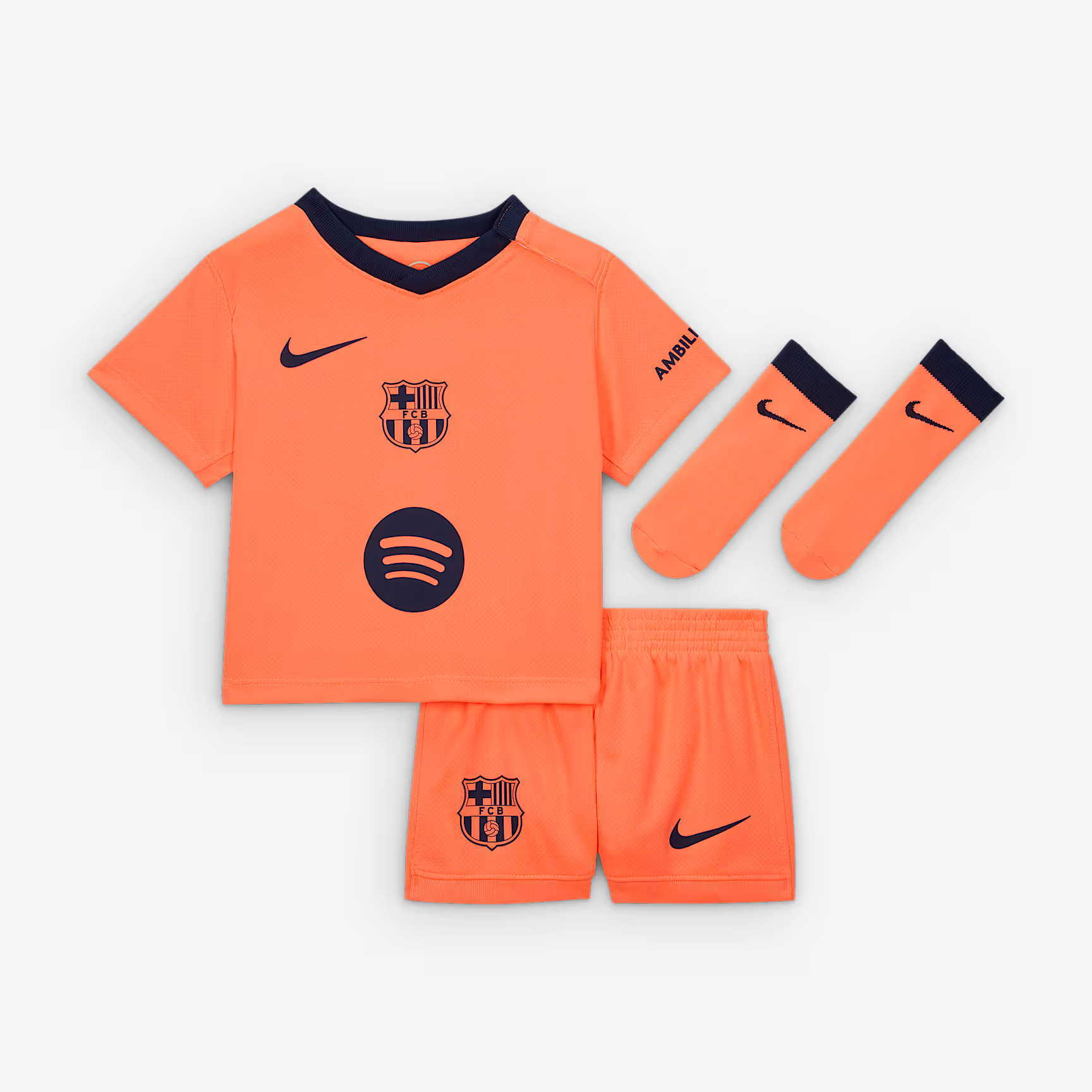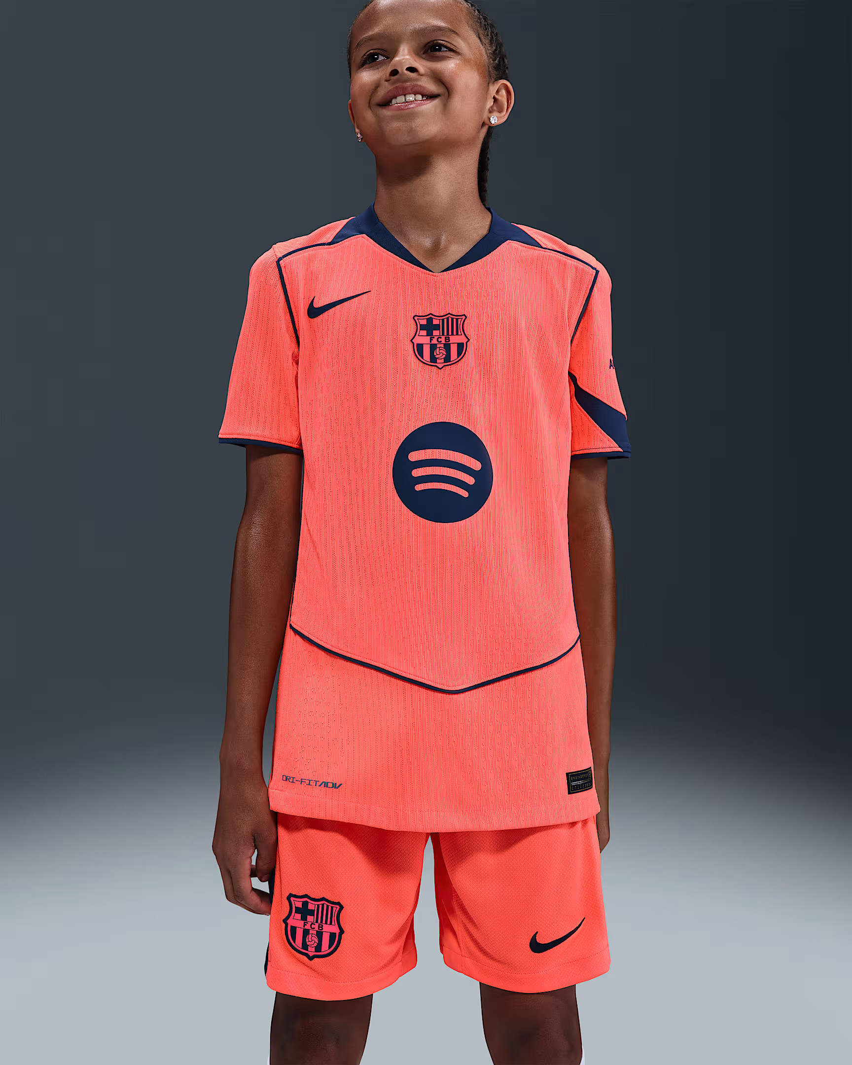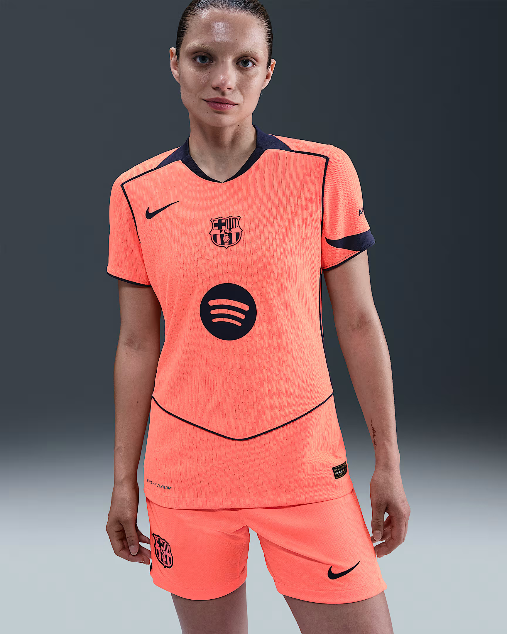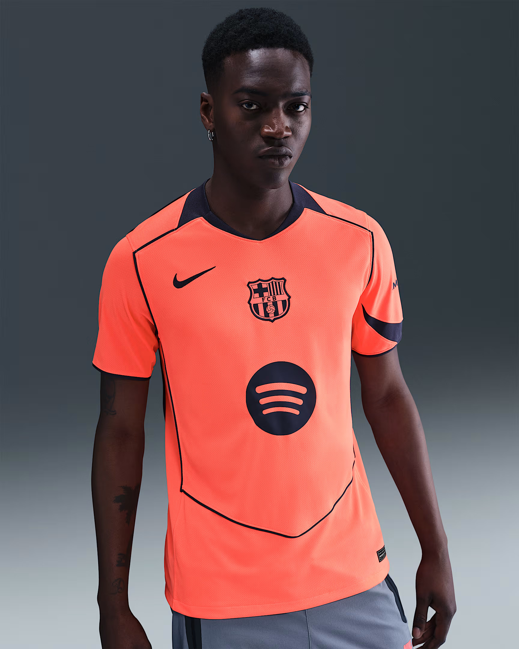 Het FC Barcelona 3e shirt 2025-2026 is dus oranje (Bright Mango) met navy blauwe (Midnight Navy) accenten. De navy blauwe details komen terug in de de naden op de zijkanten van het shirt die richting de kraag lopen en ook net boven de onderkant van het shirt eindigen. De contrastlijnen aan de onderkant van de mouwen zijn ook navy blauw. Deze naden/contrastlijnen zijn iconisch voor het Total90 template en komen ook terug op de achterzijde van het shirt. Een ander kenmerk van het template is de v-hals zonder omslag. De v-hals van het FC Barcelona 3e shirt 2025-2026 is ook navy blauw, een kleur die ook terug komt in het vlak op de linkermouw. De swoosh van Nike op de rechterborst is net iets hoger geplaatst dan we gewend zijn, wat ook weer kenmerkend is voor het Total90 template. Op het midden van de borst prijkt de badge van FC Barcelona. Dit betreft een monochrome badge. Het logo heeft namelijk niet de gebruikelijke kleuren, maar is in stijl van de kleuren van het shirt: oranje/navy. Ook de sponsorlogo's van Spotify (midden), AmbiLightTV (linkermouw) en UNHCR/ACNUR (achterkant) zijn navy blauw. Het shirt bevat ook nog een tweetal details. De binnenkant van de hals bevat het iconische Total90 logo en in de nek op de achterkant zijn de clubkleuren van FC Barcelona (Blaugrana) gecombineerd met de kleuren van de Catalaanse vlag: rood en geel.