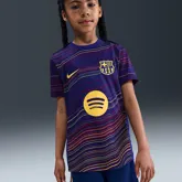 Het FC Barcelona warming-up shirt 2024 heeft een iets rijker design dan het trainingsshirt. Ook dit shirt is in stijl van de clubkleuren, maar bevat een all-over print van de contouren van het clublogo. Deze logo’s zijn in verticale banen op het trainingsshirt verwerkt. De blauwe en rode schilden wisselen elkaar af en bevatten een contrasterende omranding. Wat verder opvalt is dat de swoosh van Nike op de linkermouw van de pré match top staat en de logo’s van FC Barcelona en Spotify in het goud centraal op de borst. Ook dit trainingsshirt heeft een ronde hals. Het warming-up shirt kan gecombineerd worden met het voetbalbroekje van het trainingstenue, maar ook met het wedstrijdbroekje van het FC Barcelona voetbalshirt.
