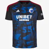 Het FC Kopenhagen uitshirt 2023-2024 wordt gekenmerkt door de all-over camouflage print in verschillende tinten (donker)blauw. Ook dit voetbalshirt heeft een ronde hals en de adidas strepen op de schouders zijn rood. Alle logo’s staan op dezelfde plek als op het thuisshirt en alle sponsorlogo’s op dit voetbalshirt zijn wit. Dit tenue wordt compleet gemaakt door een blauw voetbalbroekje en blauwe sokken met rode adidas strepen.