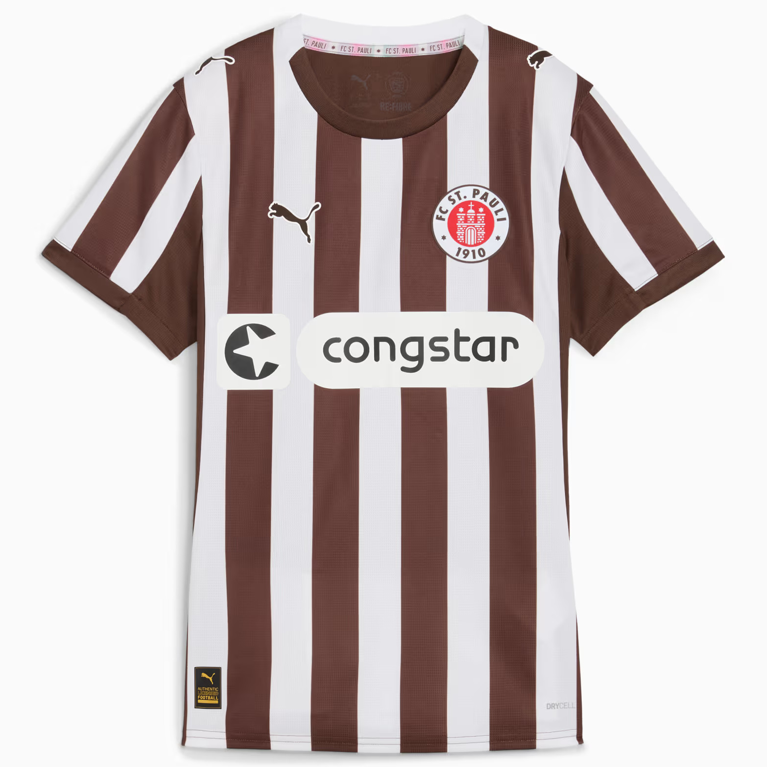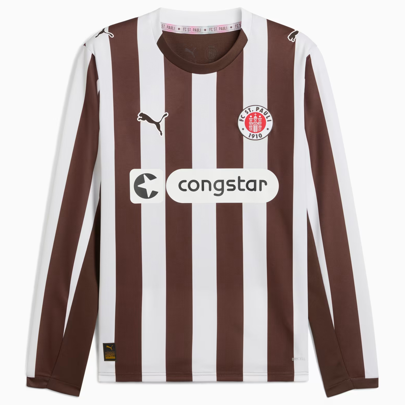 Het FC Sankt Pauli thuisshirt 2024-2025 is geïnspireerd door het voetbalshirt van het seizoen 1991-1992. Destijds was Diadora nog de kledingsponsor van de club uit Hamburg en werd het voetbalshirt gekenmerkt door de vier vlakken op de body van het voetbalshirt. Het vlak op de rechter bovenkant en linker onderkant was destijds bruin en het vlak op de linker bovenkant en rechter onderkant wit. Bovendien had het voetbalshirt van 1991-1992 een polokraag met touwtjes. Het FC Sankt Pauli thuisshirt van dit seizoen is vooral een moderne equivalent van het tenue van destijds. De blokken op dit voetbalshirt hebben twee tinten bruin, namelijk een lichte en iets donkerdere. De twee lichte vlakken bevinden zich op de rechter bovenkant en linker onderkant en de donkere vlakken op de linker bovenkant en rechter onderkant. De mouwen zijn contrasterend. Bovendien bevat het voetbalshirt witte details. De ronde hals en de band aan de onderkant van de mouwen zijn wit en hetzelfde geldt voor alle logo's op het tenue. De rechterborst en de mouwen zijn voorzien van het logo van Puma en de linkerborst bevat het clublogo. Hoofdsponsor Congstar versiert ook dit seizoen weer het midden van de FC Sankt Pauli tenues. In de nek op de achterzijde van het voetbalshirt prijkt het oprichtingsjaar van de club: 1910. Daaronder staat de naam van de club: ST. PAULI. De naam van de club prijkt bovendien in de band aan de binnenkant van de ronde hals. Het thuistenue wordt gecompleteerd door een bruin voetbalbroekje en bruine sokken met contrasterende details.