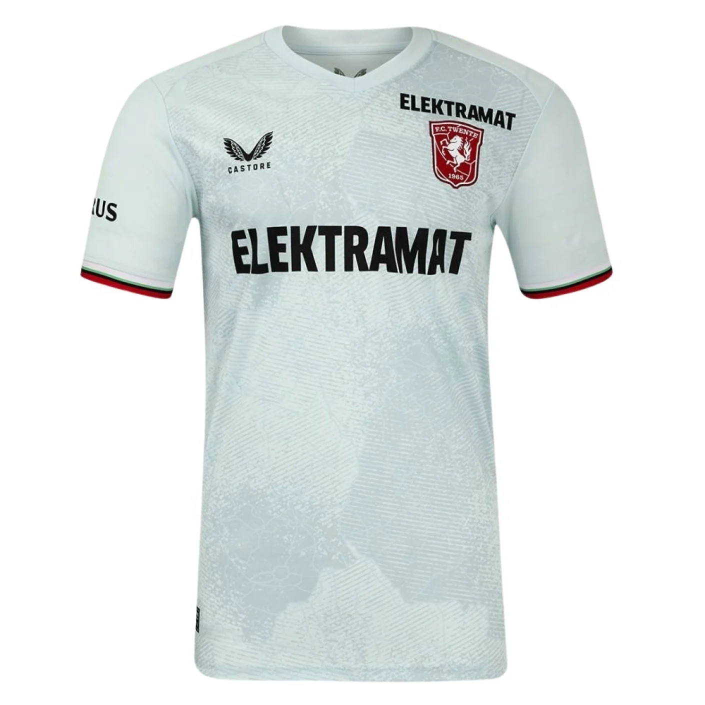 Het FC Twente uitshirt 2025 is dit jaar mintgroen en bevat een all-over print van de plattegrond van de regio Twente. Het patroon heeft wat weg van vingerafdrukken, maar betreft dus het Twentse landschap in combinatie met een plattegrond. Dit is niet het enige detail van het uittenue. De band aan de onderkant van de mouwen is namelijk groen/zwart/rood. Deze kleuren zijn afgeleid van de clubs waaruit FC Twente in 1965 is ontstaan: Enschedese Boys en Sportclub Enschede. In de nek op de achterzijde van het uittenue prijkt het stadswapen van Enschede. Alle logo’s staan op de gebruikelijke plekken. De rechterborst bevat het logo van Castore en op de linkerborst prijkt de badge van de club uit Enschede. Hoofdsponsor Elektramat staat zowel op het midden van het tenue als boven het FC Twente logo. De rechtermouw bevat het logo van Taurus, de linkermouw het logo van TOTO en op de achterkant prijkt het logo van Thermo Solutions. Het uittenue van FC Twente wordt compleet gemaakt door een mintgroen short, waarop ook de logo’s van de club en Castore staan. De sokken van het uittenue zijn ook mintgroen en hebben aan de bovenkant een groene, zwarte en rode band, geïnspireerd door de clubkleuren van Enschedese Boys en Sportclub Enschede. Op de sokken prijkt ook het oprichtingsjaar van FC Twente: 1965.