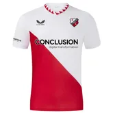 Het Castore FC Utrecht thuisshirt 2024-2025 heeft het kenmerkende design! Ook dit jaar heeft het shirt weer de iconische rood/witte diagonaal. De rechterkant is overwegend rood en de linkerkant wit. De diagonale lijn loopt vanaf de rechter oksel naar de linker onderkant. Achter de diagonaal schuilt een historisch verhaal. Het is namelijk een hommage aan Sint Maarten, de beschermheilige van de stad Utrecht. Dat zit zo: De heilige deelde zijn rode mantel met een bedelaar, waardoor zijn witte onderrok zichtbaar werd. Dit is de reden dat het stadswapen van Utrecht en het clublogo een rood/witte diagonaal hebben. De rood/witte diagonaal is ook doorgetrokken in het meest opvallende detail van het FC Utrecht thuisshirt, namelijk in de brede v-hals. Hier bevindt zich een design van rode en witte chevrons, geïnspireerd door de diagonaal. Ook de witte band aan de onderkant van de mouwen is uitgerust met een kleine rode driehoek, die geïnspireerd is door hetzelfde idee. Het DNA van de stad en de club is echter op nog meer plekken aanwezig. Op de voorkant van het shirt prijkt namelijk ook een klein icoontje van de Domtoren en in de nek op de achterkant van het tenue staan weer de drie logo’s van de clubs waaruit FC Utrecht in 1970 is ontstaan: DOS, USV Elinkwijk en Velox. Alle logo’s staan op de gebruikelijke plekken. De rechterborst bevat het logo van Castore, de linkerborst de badge en op het midden prijkt het logo van de nieuwe hoofdsponsor Conclusion Digital Transformation. De linkermouw is uitgerust met het logo van U4U.