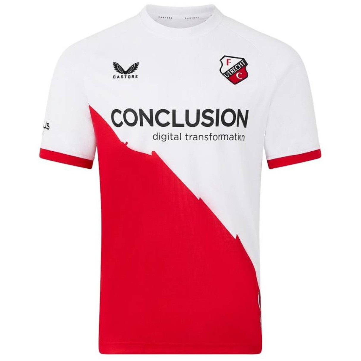 Het FC Utrecht thuisshirt 2023-2024 heeft het iconische, diagonale half-om-half design. De rechterkant en de onderkant zijn rood en de linkerkant en bovenkant zijn wit. Beide delen worden gescheiden door een diagonale baan van de rechter oksel naar de linker onderkant. Op de voorkant van het thuisshirt is ook een speciaal ''pulse'' patroon verwerkt, geïnspireerd door de hartslag van Utrecht, het bruisende middelpunt van Nederland. Daarnaast is deze print een verwijzing naar de geluidsgolven van de supporters, die de club als twaalfde man aanmoedigen in het Galgenwaard. Het voetbalshirt heeft een ronde hals met twee rode lijnen en een dunne, witte lijn. Dit design komt ook weer terug in de band aan de onderkant van de mouwen. Het voetbalshirt bevat ook nog een aantal details. Op de linker onderkant prijkt een icoon van de Domtoren en in de nek op de achterzijde van het voetbalshirt staan de logo's van de clubs waaruit FC Utrecht is ontstaan: DOS, USV Elinkwijk en Velo. De rechterborst bevat het logo van Castore de linkerborst het clublogo en op het midden van het voetbalshirt staat hoofdsponsor T-Mobile. De linkermouw is uitgerust met het logo van U4U, een initiatief van de club om mensen te begeleiden op de arbeidsmarkt. Het FC Utrecht thuistenue 2023-2024 wordt compleet gemaakt door een rood voetbalbroekje en rood/witte kousen.