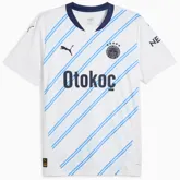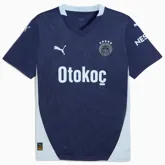 Het Fenerbahçe uitshirt 2024-2025 is dit jaar wit met een design van dunne lichtblauwe diagonale lijnen. Tussen de blauwe lijnen bevindt zich een speciaal Ottomaans patroon. Het uitshirt heeft dezelfde kraag als het thuisshirt, waarbij het rechte gedeelte wit is en het diagonale gedeelte navy blauw. Ook alle logo’s op het Fenerbahçe uitshirt zijn navy blauw. Deze staan op dezelfde plek als op het thuisshirt, evenals alle details. Dit tenue wordt compleet gemaakt door een navy blauw broekje met witte details. De sokken zijn wit met navy blauwe accenten.