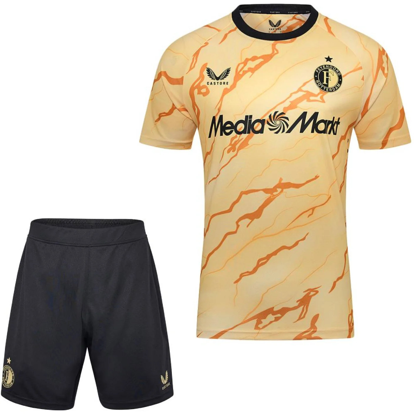 Het gouden shirt van dit seizoen heeft een ander thema. Dit voetbalshirt is namelijk geïnspireerd door de iconische spelerstunnel van de Kuip. De muren van de tunnel zijn goudgeel geschilderd en wordt gekenmerkt door de artistieke vormen. Deze artistieke vormen bevinden zich als all-over print op het Feyenoord 4de shirt. Het shirt heeft namelijk een patroon van bliksemschichten in verschillende tinten goud. Verder heeft het vierde voetbalshirt zwarte details. De ronde hals is zwart en hetzelfde geldt voor alle logo’s, die op de standaard plekken staan. De rechterborst bevat het logo van Castore, de linkerborst het clublogo, Mediamarkt staat op het midden en op de achterkant staat Prijsvrij Vakanties. Het Feyenoord logo betref een monochrome badge. Het logo heeft namelijk niet de gebruikelijke kleuren, maar is in stijl van de kleuren van het shirt: goud/zwart. In de nek op de achterzijde prijkt weer het oprichtingsjaar: 1908.