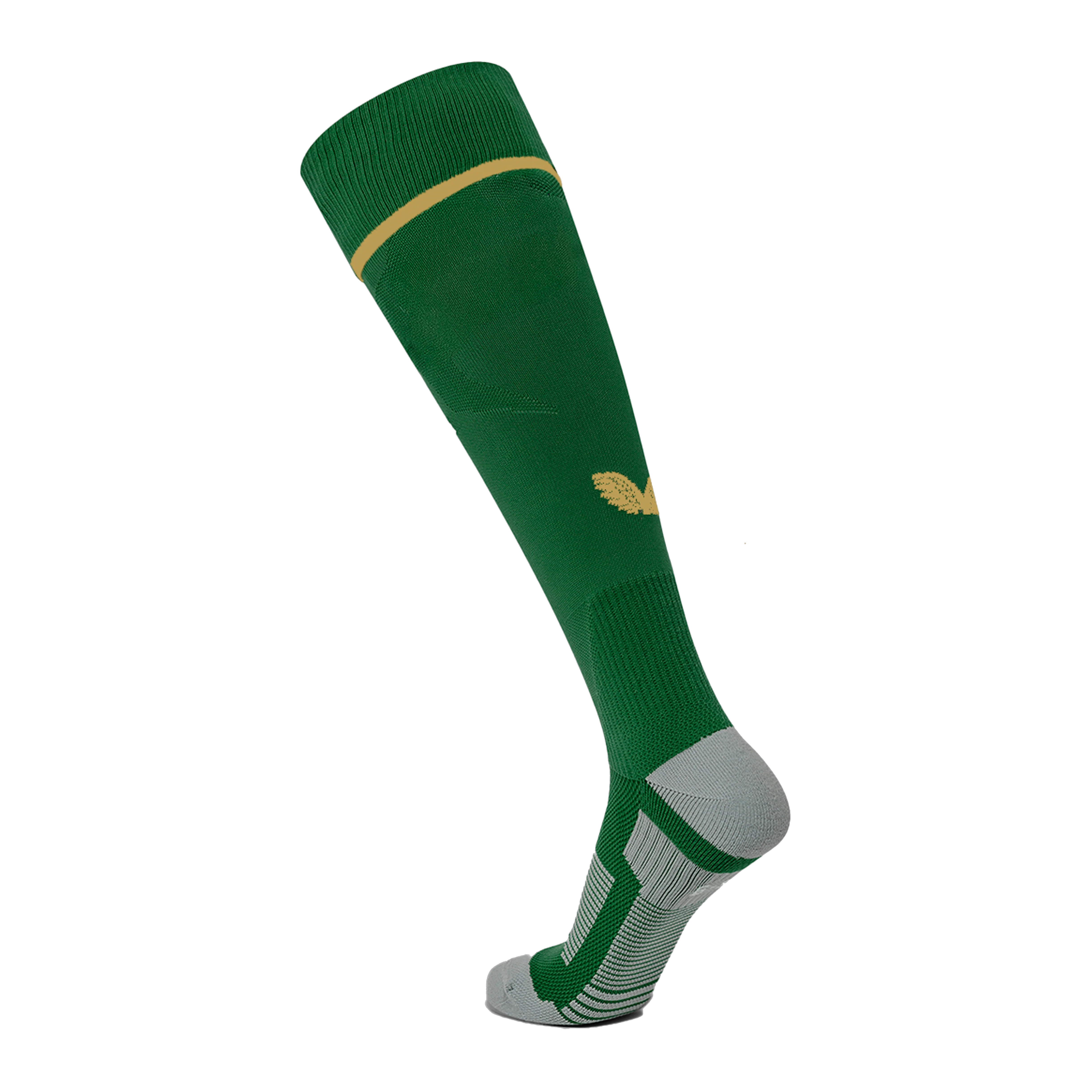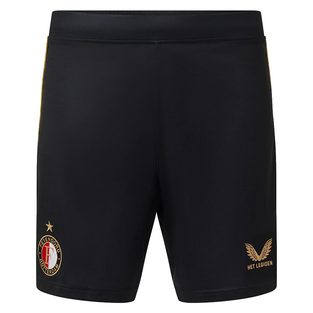 Het vierde tenue van Feyenoord wordt compleet gemaakt door een zwart voetbalbroekje met gouden logo’s van Castore en de club. De sokken zijn goud en bevatten op het midden de iconische F en het Castore logo in het zwart.