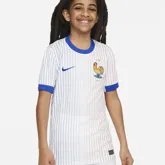 De logo's van Nike en de Franse voetbalbond op het voetbalshirt zijn blauw. De rechterborst bevat de swoosh van Nike en de linkerborst het logo van de Franse voetbalbond, de Fédération Française de Football (FFF). Boven het logo van de voetbalbond staan twee blauwe sterren, welke verwijzen naar de gewonnen WK's van 1998 en 2018. De zijkanten van de onderkant van het tenue bevatten een driehoek in de kleuren van de nationale vlag: blauw/wit/rood. Het Frankrijk uitshirt heeft verder alle kenmerken van het nieuwe Nike template. Het tenue bevat namelijk een ronde hals met daaronder een ronding. Deze ronding komt ook weer terug op de achterzijde van het tenue. In de binnenkant van de hals is het bekende motto van ''Les Bleus'' verwerkt: ''Nos Differences Nous Unissent'' (Onze verschillende verenigen ons). Het Frankrijk uittenue wordt gecompleteerd door een blauw voetbalbroekje, waarop de logo's van de Franse voetbalbond en Nike in het blauw staan. De zijkanten van het voetbalbroekje bevatten een opening met een vlak in de kleuren van de Franse vlag. Het voetbalbroekje bevat ook details in de kleuren van de Franse vlag. De kousen van het Frankrijk uittenue zijn wit met een ''Toile de Jouy'' print en een blauwe swoosh.