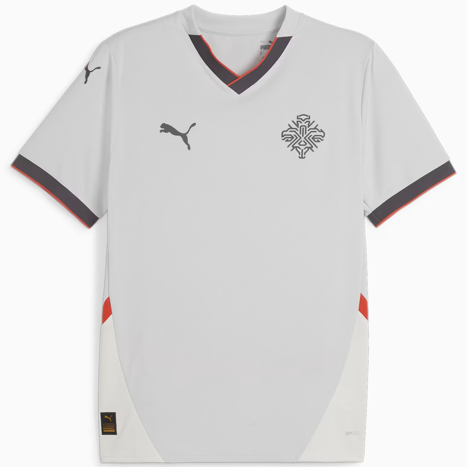 Het Ijsland uitshirt 2024-2025 verlicht de velden en de tribunes wanneer het Ijslands voetbalelftal de uitwedstrijden speelt. Het witte voetbalshirt is geaccentueerd met grijze accenten, als verwijzing naar de energie van het vulkanische landschap in het land. Bovendien bevat het uitshirt vurige accenten, die de kracht, passie en vastberadenheid van het team vertegenwoordigen. Deze kleurencombinatie komt terug in de v-hals en in de band aan de onderkant van de mouwen. De diagonale band op de zijkanten van het uitshirt is fel rood, terwijl de logo’s van Puma en de voetbalbond asgrijs zijn. Het uittenue wordt gecompleteerd door een grijs voetbalbroekje met rode accenten. De sokken zijn wit met ook weer donkergrijze en rode details.