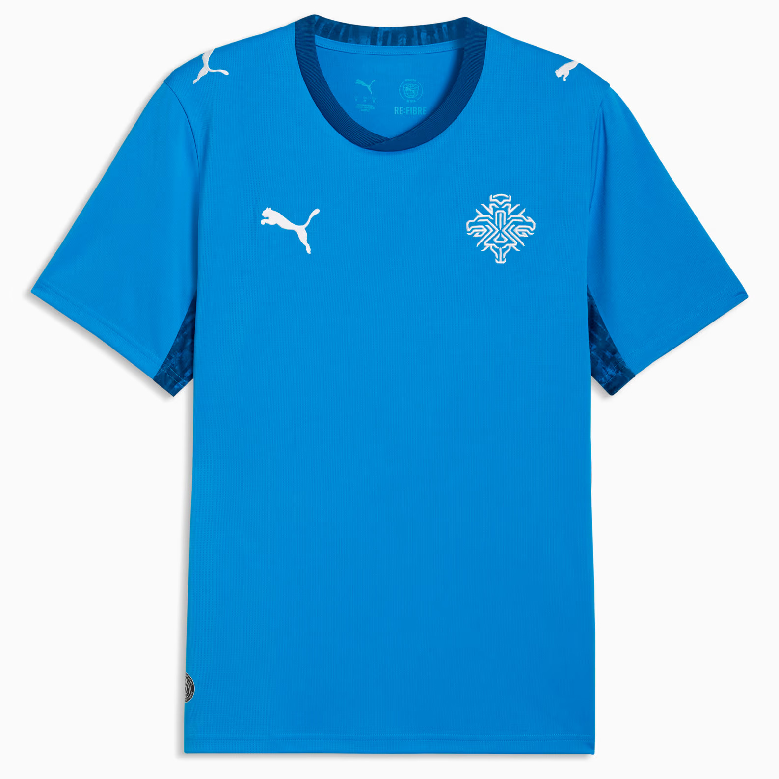 Het Ijsland thuisshirt 2026-2027 heeft een vrij eenvoudig design, dat perfect past bij de identiteit van het land: koel van uiterlijk, maar doordrenkt met een stille intensiteit en de belofte van een nieuwe eruptie op het wereldtoneel. Het shirt is blauw met donkerblauwe accenten. Deze kleur komt terug in de ronde hals en het diagonale vlak op de zijkanten. Het meest opvallende aan het Ijsland shirt is het patroon dat aan de zijkanten van de mouwen en op de achterkant van de ronde hals is verwerkt. Dit design verwijst naar de kenmerkende ijzige landschappen van IJsland. De strakke lijnen en scherpe vormen in het motief doen denken aan gebarsten ijs, gletsjers en bevroren structuren die overal in het land zichtbaar zijn. Tegelijkertijd weerspiegelt het de vurige kracht van een land die altijd op het punt lijkt te staan opnieuw uit te barsten. Deze combinatie van uitersten, het ijs van de gletsjers en het vuur van vulkanische energie, komt samen in een shirt dat het pure DNA van Ijsland uitstraalt.
