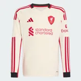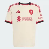 Het Liverpool uitshirt 2025-2026 is off white (een net iets donkerdere tint wit) met rode en zwarte accenten. Het diagonale/opstaande gedeelte van de v-hals is rood/zwart en hetzelfde geldt voor de mouwboorden. De frisse rode kleur komt ook terug in de adidas strepen op de schouders, de meshpanelen op de zijkanten en in alle sponsorlogo’s op het Liverpool FC uitshirt. De rechterborst bevat het logo van adidas, op het midden staat sponsor Standard Chartered en de linkermouw is uitgerust met het logo van Expedia. Het meest opvallende aan het Liverpool FC uitshirt is het logo op de linkerborst. De iconische Liverbird is namelijk verwerkt in een rood schild. De vorm van het schild is geïnspireerd op de vorm van de Main Stand van Anfield uit 1906 en geeft het shirt een retro look. Dit is niet het enige detail van het uitshirt. Traditiegetrouw staat in de nek op de achterkant het getal 97 tussen twee vlammen, verwijzend naar de bij het Hillsborough drama omgekomen supporters van de club.