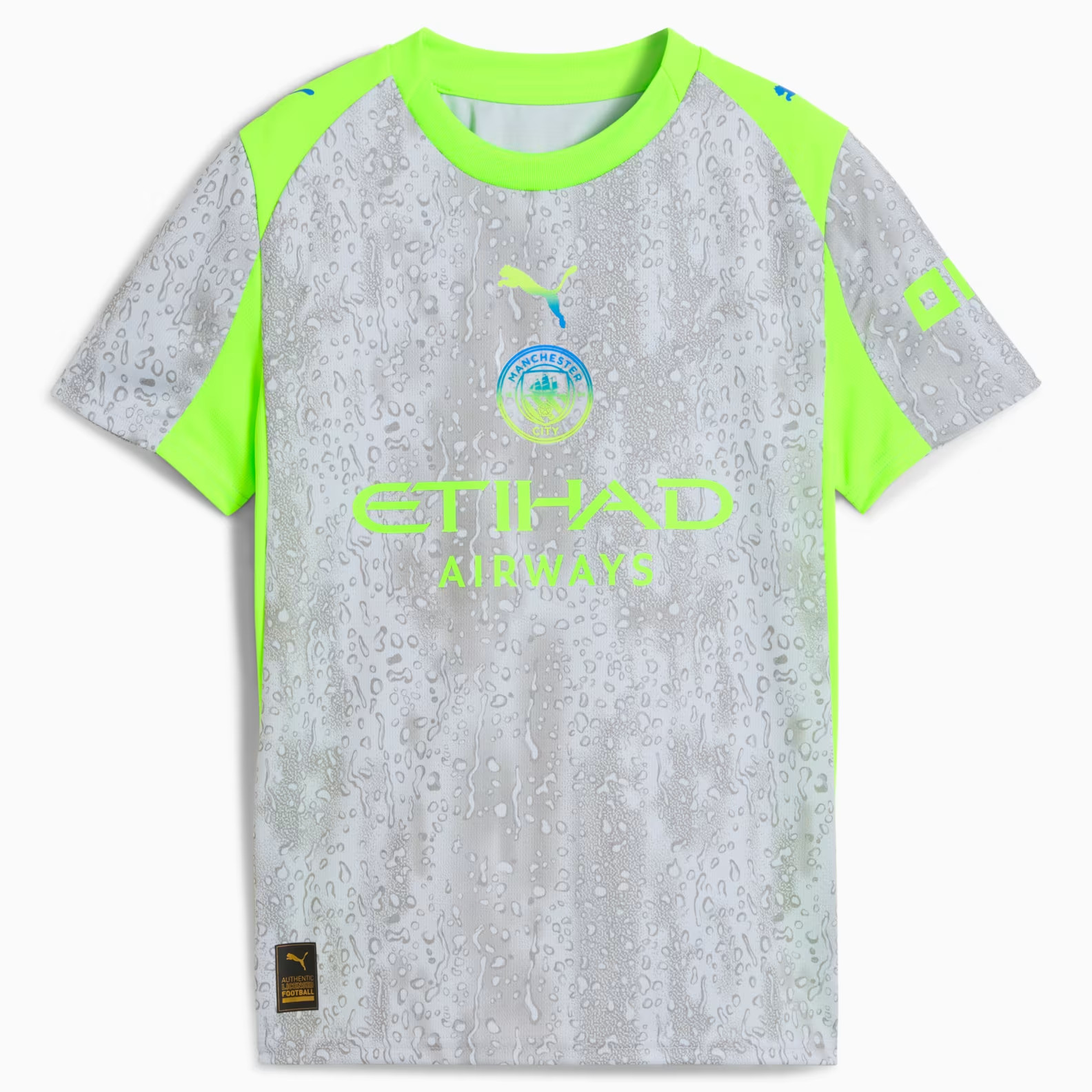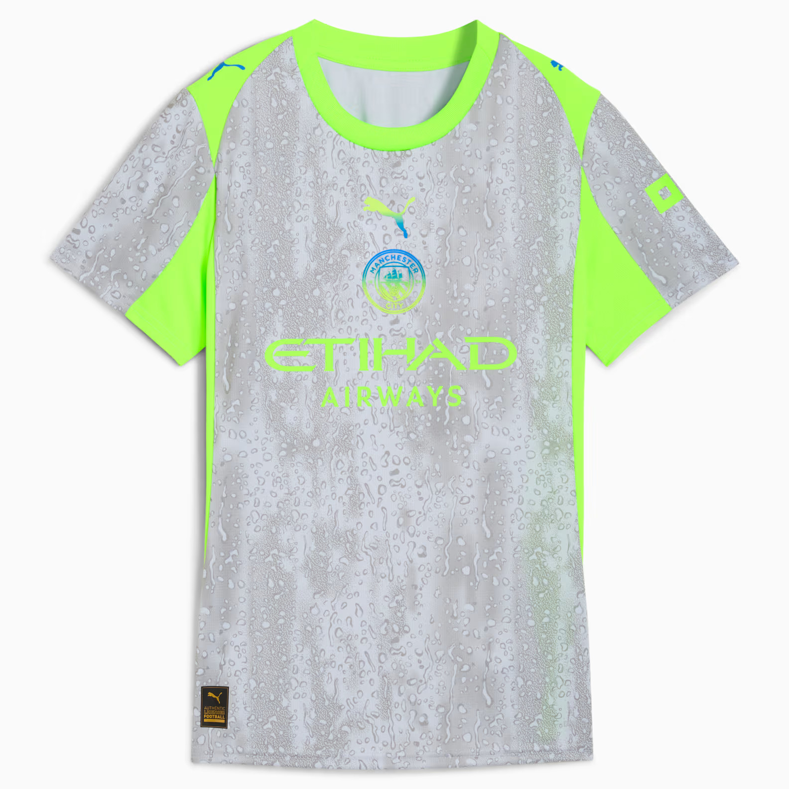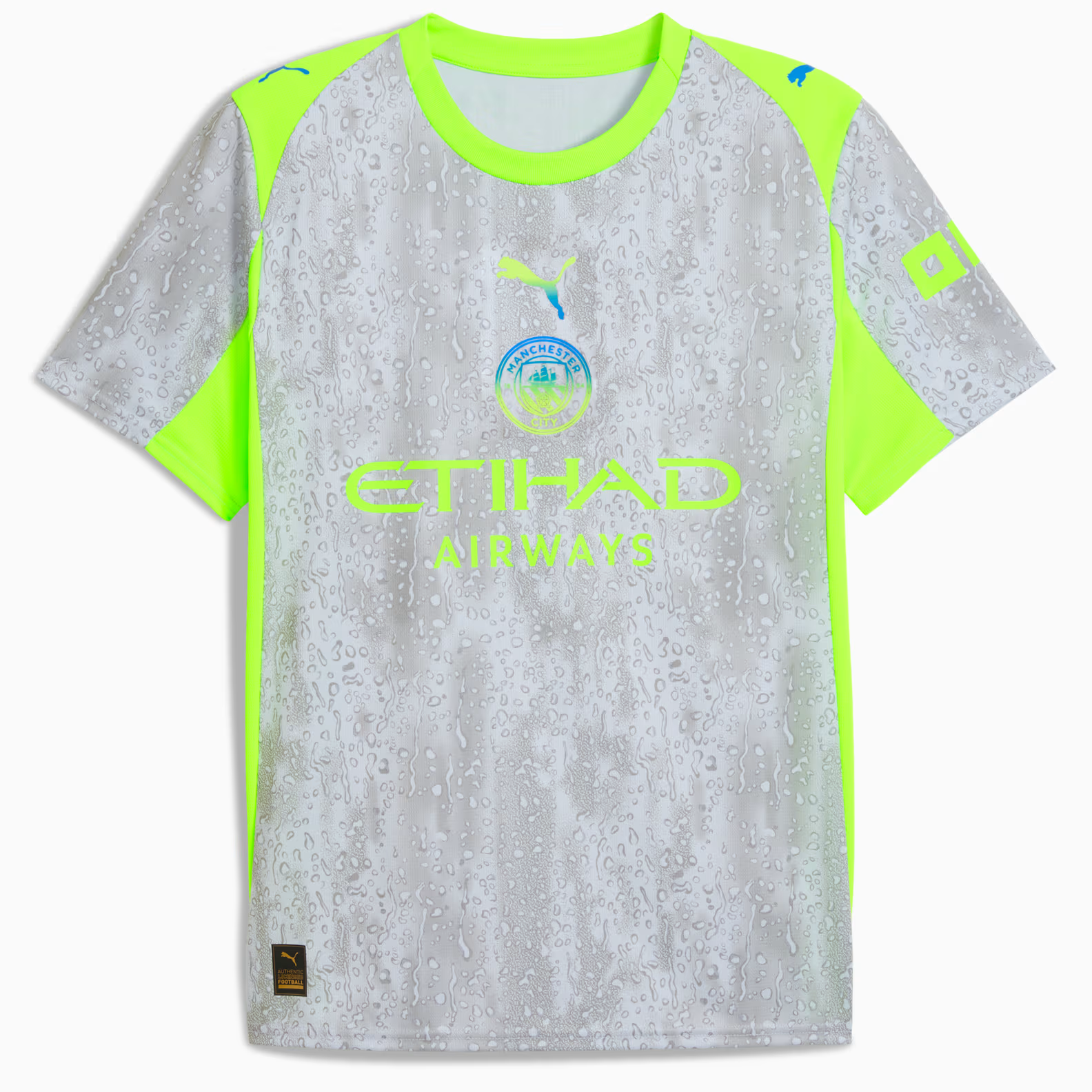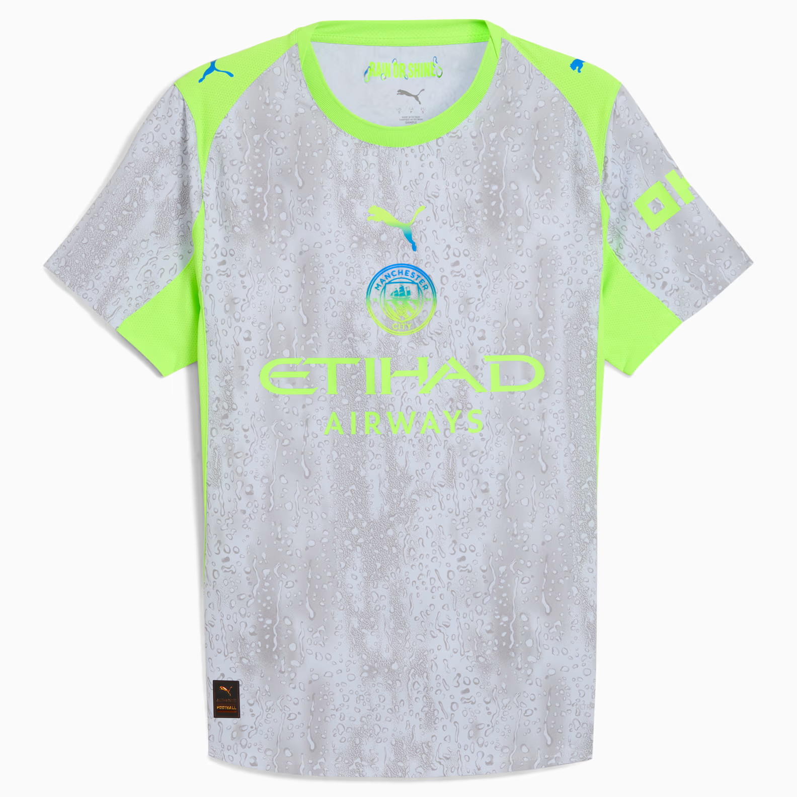Het Manchester City 3e shirt 2025-2026 is gemaakt voor de stad die speelt in de regen. ''City'' belichaamt de mensen, de cultuur en de onverwoestbare geest van Manchester. Dit tenue is voor iedereen die de club in het hart draagt, of de zon nu schijnt of de regen met bakken uit de lucht valt. Want ook al hangen de grijze wolken vaak boven de stad, Manchester City brengt altijd sprankelend, bliksemachtig voetbal op het veld. Het typische Britse weer komt dan ook terug in het opvallende patroon op het shirt! Het shirt is overwegend grijs en bevat een all-over print van druppels, die doen denken aan regendruppels die langs een raam naar beneden glijden. De bedenkers van het tenue zijn in ieder geval creatief geweest. Het grijze design wordt aangevuld met fel groene details, een kleur die symbools staat voor de klasse van Mancheste City. De ronde hals en de diagonale vlakken op de mouwen en de zijkanten van het shirt zijn fel groen, evenals de logo’s. Alle logo’s staan centraal op shirt. In de logo’s van Puma en Manchester City is een special effect verwerkt. Deze zijn namelijk een combinatie van blauw en fel groen met een fading effect. Het logo van Puma prijkt boven het clublogo en daaronder staat het logo van sponsor Etihad Airways. De linkermouw is voorzien van het logo van OKI. In de nek op de achterzijde van het Manchester City 3e shirt prijkt het motto van de club: ‘’Rain or shine’’, verwijzend naar één van de liederen van de supporters in het Etihad Stadium: Come Rain or Come Shine (Frank Sinatra).
