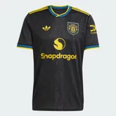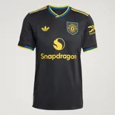 Evenals het shirt van dertig jaar geleden heeft het Manchester United 3e shirt dit seizoen een design van verticale zwarte en donkergrijze banen. Waar deze banen destijds nog een patroon van chevrons hadden, geïnspireerd door het logo van Umbro, zijn deze dit seizoen uiteraard weg gelaten. In plaats daarvan bevat het shirt een speciaal ‘devil-base’-weefsel, waarin subtiel het iconische duivelmotief van de club is verwerkt. De polokraag is ingeruild voor een overlappende v-hals in het geel/navy, de kleuren die destijds ook in het uitshirt terug kwamen. De band aan de onderkant van de mouwen heeft ook deze kleurencombinatie en de adidas strepen op de schouders zijn geel. Hetzelfde geldt voor de logo’s van adidas (rechterborst), Snapdragon (midden) en DXC Technology (linkermouw) Het adidas logo op het 3e shirt betreft evenals vorig seizoen de adidas trefoil. Het retro logo fungeert tegenwoordig als het logo van adidas Originals. Het clublogo op de linkerborst is ook geïnspireerd door het logo op het uitshirt van 1993-1995. De badge op het shirt heeft namelijk de vorm van een schild. Op de achterkant van de kraag bevindt zich een bijzonder detail: de gele drietand van de duivel, geplaatst tegen een zwart-grijze achtergrond. Deze subtiele sign-off staat symbool voor de trots en onverzettelijkheid die Manchester United door de decennia heen hebben gekenmerkt.