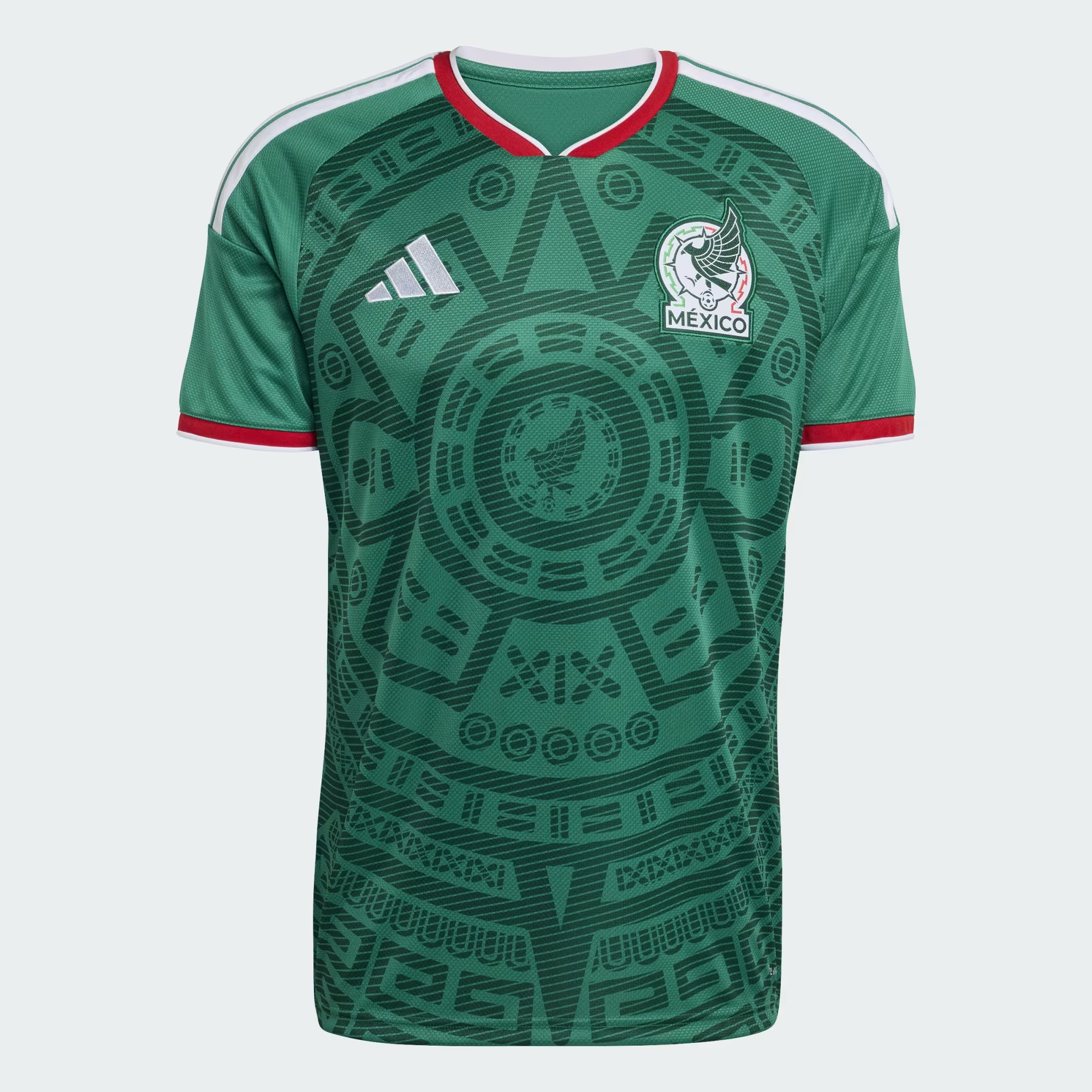 Het nieuwe Mexico WK 2026 shirt grijpt terug op dat iconische tijdperk en bevat een all-over print van verschillende geometrische vormen en details die verwijzen naar de Azteken. In tegenstelling tot het Mexico Gold Cup voetbalshirt 2025 is het shirt bijna volledig donkergroen, waarbij donkere geometrische vormen samenkomen in een groot centraal embleem. Bovendien bevat het shirt de andere kleuren van de nationale vlag: rood en wit. De v-hals is namelijk rood en bevat een subtiele witte lijn. Dit design komt ook weer terug in de band aan de onderkant van de mouwen. Een kenmerk van alle adidas WK 2026 voetbalshirts zijn de bredere adidas strepen op de schouders. Op het nieuwe Mexico voetbalshirt zijn deze strepen wit. Op de rechterborst prijkt het adidas logo in het wit en de linkerborst bevat de badge van de Mexicaanse voetbalbond, de Federación Mexicana de Fútbol (FMF). In de nek op de achterkant staat in een Azteeks lettertype en in de kleuren van de vlag de tekst: ‘’SOMOS MEXICO’’ (Wij zijn Mexico). Het Mexico WK 2026 thuistenue wordt compleet gemaakt door een wit short met aan weerszijden groene adidas strepen. Op de shorts staan ook de logo’s van de Mexicaanse bond en adidas. De sokken van het thuistenue zijn groen en bevatten aan de bovenzijde witte adidas strepen.