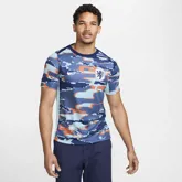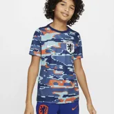 Het Nike Nederlands Elftal warming-up shirt heeft ook dit jaar weer een opvallend design. Het warming-up shirt heeft dezelfde kleuren als het Nederlands Elftal EK 2024 uitshirt en had ook makkelijk door kunnen gaan als uitshirt. Het voetbalshirt is een combinatie van blauw, lichtblauw, donkerblauw en oranje en bevat een gepixelde print van vlekken. In deze vlekken kun je met wat fantasie de contouren van de grenzen van Nederland ontdekken en het blauwe gedeelte daaromheen staat ongetwijfeld symbool voor de Noordzee. Het warming-up shirt is naast het nieuwe thuisshirt en uitshirt het enige item dat geen standaard template heeft. Het voetbalshirt heeft een donkerblauwe ronde hals, de swoosh van Nike op de rechterborst is wit en het schild van het KNVB logo op de linkerborst is wit met een donkerblauwe leeuw. Het inloopshirt kan gecombineerd worden met de wedstrijdbroekjes van de tenues, maar ook met het trainingsbroekje, waarover straks meer.