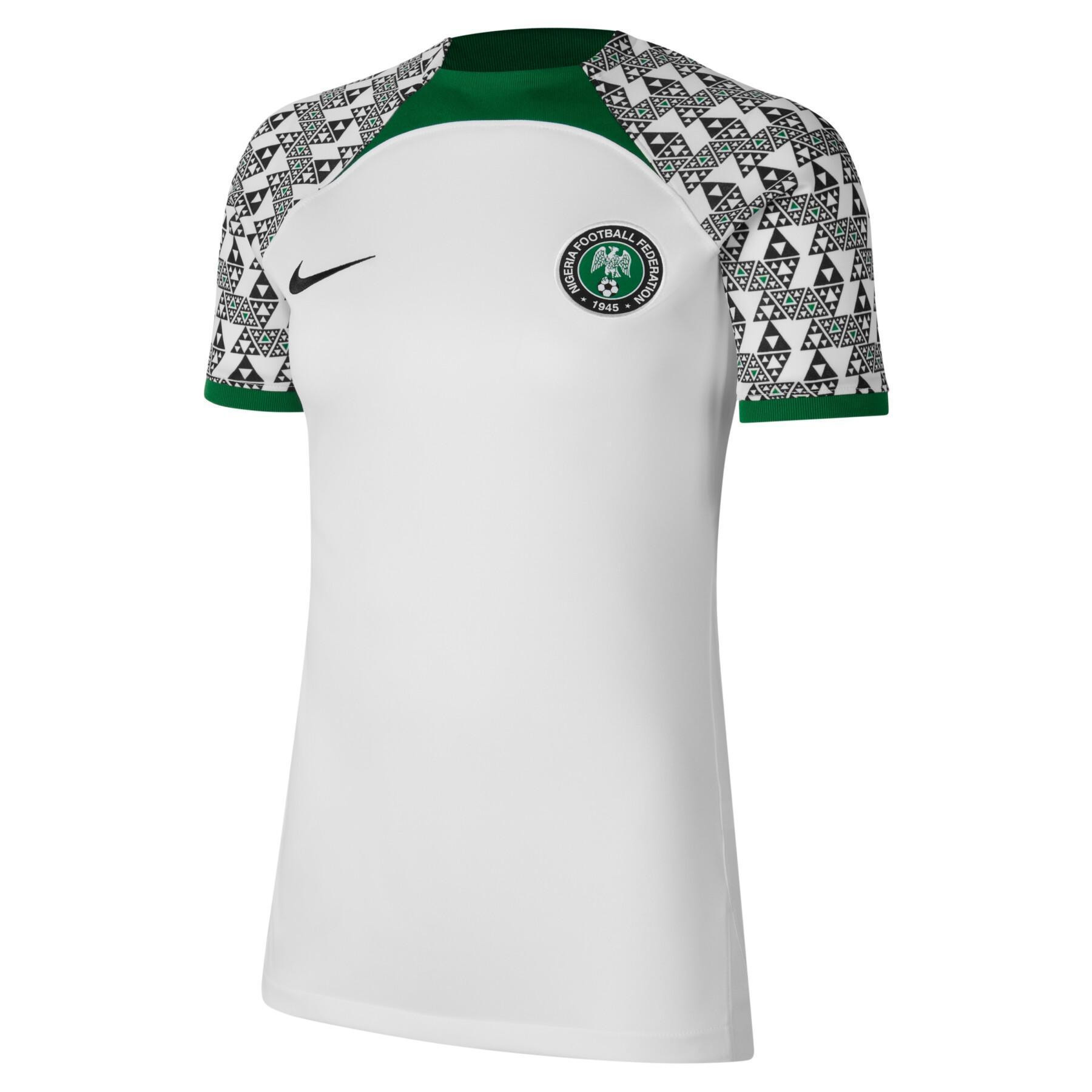 Het Nigeria uitshirt 2022-2023 is dit jaar overwegend wit en bevat een graphic patroon van driehoeken op de mouwen. In de zwarte driehoeken zijn kleinere groene en witte driehoekjes verwerkt. Deze driehoeken verwijzen naar de typische Nigeriaanse klederdracht. Het uitshirt heeft alle kenmerken van het nieuwe template van Nike. Het voetbalshirt bevat een ronde hals met een groen vlak. Daaronder bevindt zich een ronding. Dit is ook het design van de achterzijde van het uitshirt. Op de rechterborst staat de swoosh van Nike in het zwart en de linkerborst bevat het logo van de voetbalbond. Het Nigeria uittenue wordt gecompleteerd door een donkergroen voetbalbroekje. De kousen zijn hetzelfde als de kousen van het thuistenue.