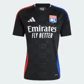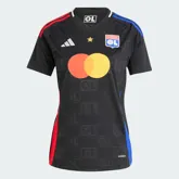 De sponsorlogo’s op het uitshirt zijn wit. De rechterborst bevat het adidas logo, op het midden van het voetbalshirt van de mannen staat het logo van Emirates Fly Better en op het shirt van de vrouwen het logo van Mastercard. De linkerborst is weer uitgerust met het clublogo. Het Olympique Lyon uittenue 2024-2025 wordt gecompleteerd door een zwart voetbalbroekje met aan weerszijden zwarte golven. Op de shorts ontbreken dit jaar de adidas strepen op de zijkanten. De sokken zijn ook overwegend zwart en hebben op de achterkant een rode en blauwe golf.