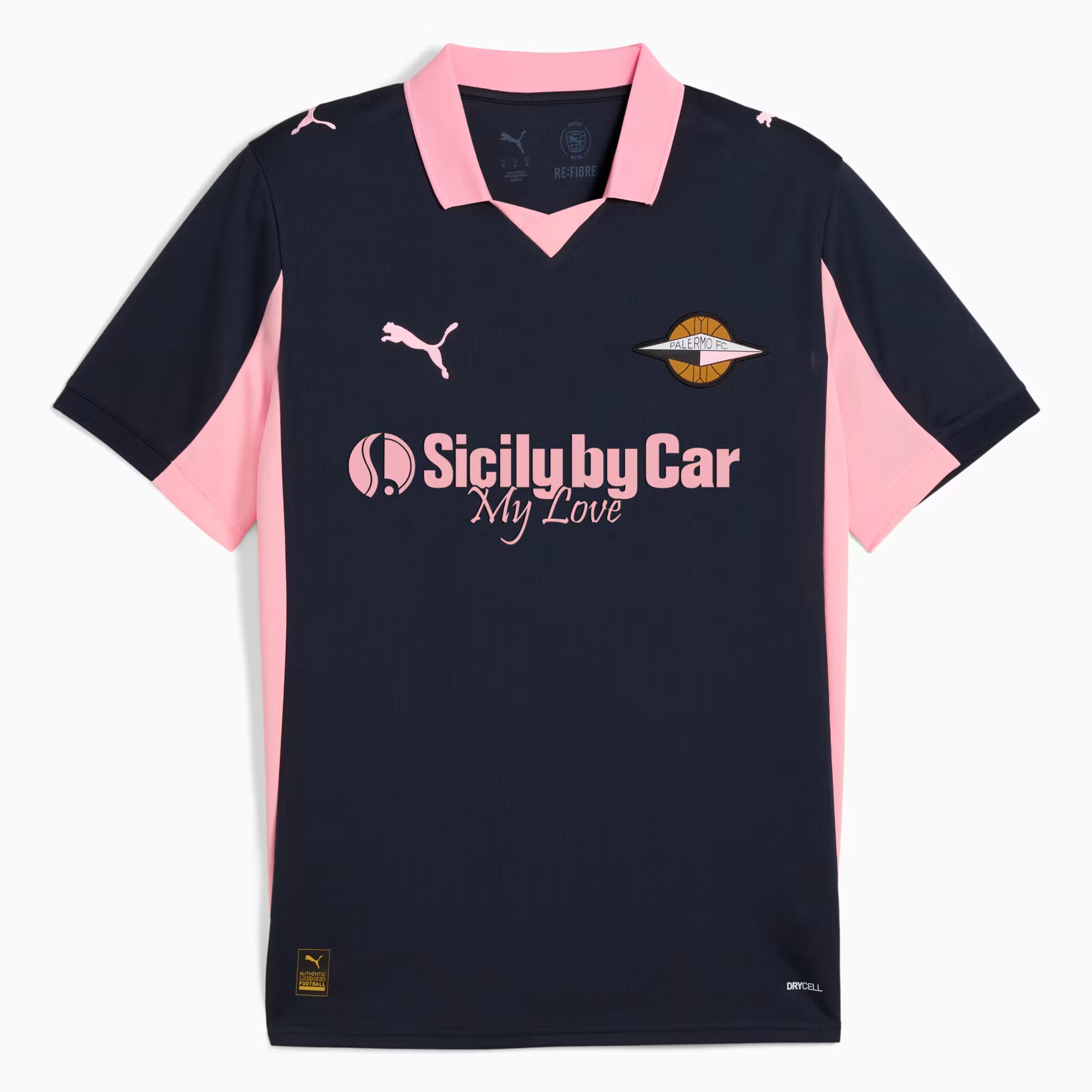 Het Palermo FC uitshirt 2025-2026 is een ode aan de Britse roots van de club. Het design van het shirt is namelijk geïnspireerd door de shirts uit het begin van de 20e eeuw. Het shirt is ‘’Deep Navy’’, een kleur die in de vroege decennia van de vorige eeuw vaak terug te zien was in de tenues van Engelse voetbalteams. De roze polokraag en de band aan de zijkanten zorgen voor een subtiel contrast en geven het shirt een klassieke, bijna tijdloze uitstraling. Wat het uitshirt vooral bijzonder maakt, is de terugkeer van het historische futuristische clublogo. Voor het eerst prijkt het op een officieel wedstrijdshirt: de beroemde diamanten badge met een klassieke voetbal in het midden, ontworpen in 1929 door Pippo Rizzo, een exponent van het Siciliaanse Futurisme. Destijds werd het gekozen als modern en vooruitstrevend alternatief voor de traditionele wapenschilden die te conventioneel werden gevonden. Het logo van PUMA op de rechterborst en de mouwen zijn ook roze en hetzelfde geldt voor het logo van SiclyByCar op het midden, het logo van L.T. op de mouwen en inx.AERO op de achterkant. In de nek op de achterzijde staat opnieuw het motto van de club: Siamo Aquile. Het Palermo FC uittenue wordt compleet gemaakt door een navy blauw short en sokken met roze accenten.