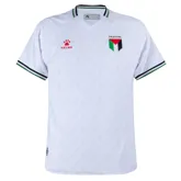 Het Palestina uitshirt 2024-2025 is wit en heeft een half-om-half design. De rechterkant heeft een iets andere tint wit dan de linkerkant. Verder bevat het uitshirt rode accenten. De v-hals is rood en hetzelfde geldt voor de band op de schouders en de band aan de onderkant van de mouwen. De band op de schouders wordt geflankeerd door een gouden lijn. Het logo van Kelme op de rechterborst betreft een ander logo dan op het thuisshirt. Verder staan alle logo’s op dezelfde plek als op het thuisshirt. Het uittenue wordt compleet gemaakt door een wit voetbalbroekje en witte sokken.