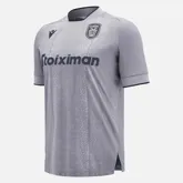 Het PAOK Saloniki 3e shirt 2024-2025 is ook zilver. Dit shirt heeft een iets donkerdere tint dan het uitshirt. Het 3e shirt heeft ook een all-over print met een brushed effect, waarin verticale lijnen verwerkt zijn. Het design heeft iets weg van een sterrenhemel. Het derde shirt is verder uitgerust met een rechte hals met diagonaal gedeelte. Dit gedeelte is navy blauw, evenals de band aan de onderkant van de mouwen en alle logo’s op het 3e shirt. Het PAOK Saloniki derde tenue wordt compleet gemaakt door een zilver short en zilveren sokken met navy blauwe accenten.