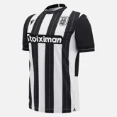 Het PAOK Saloniki thuisshirt 2024-2025 heeft dit jaar weer een design van verticale zwarte en witte banen. De zwarte banen bevatten dit jaar een design van diagonale streepjes, die het shirt een elegante touch geven. Bovendien zijn de zwarte banen voorzien van dunne verticale zilveren lijnen. Dit design komt ook terug in de ronde hals en de band aan de onderkant van de mouwen. De rechterborst en de mouwen zijn uitgerust met het logo van Macron, de linkerborst bevat het clublogo en hoofdsponsor Stoiximan staat op het midden van het shirt. De binnenkant van de hals van alle PAOK Saloniki voetbalshirts 2024-2025 bevat een label in de clubkleuren met daarin de logo’s van de club en Macron. In de nek op de achterkant van de PAOK Saloniki voetbalshirts staat de naam van de club: PAOK FC. Het thuistenue wordt compleet gemaakt door een zwart voetbalbroekje en zwarte sokken met witte details.