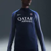 De Nike Paris Saint Germain training sweater 2024-2025 is overwegend groen (door Nike ‘’Geode Teal’’ genoemd) en bevat in de vorm van bordeaux rode en gouden tinten elegante details. De training sweater heeft alle kenmerken van het Nike Strike template. Dit is het standaard template dat dit jaar door Nike gebruikt wordt voor alle trainingskleding. De golf op de schouders, kenmerkend voor het Strike template, is bordeaux rood en alle logo’s op de training sweater zijn goud (‘’Guave Ice’’). De logo’s staan op de gebruikelijke plekken. De rechterborst bevat de swoosh van Nike, de linkerborst het clublogo en op het midden van de training sweater staat sponsor Qatar Airways. De training sweater heeft ook dit jaar weer de gebruikelijke functionele kenmerken. De sweater is uitgerust met een semi-hoge hals met een rits tot de borst en de onderkant van de mouwen bevatten duimgaten, voor de perfecte pasvorm. Het materiaal van de Paris Saint Germain training sweater betreft een combinatie tussen polyester (91%) en elastaan (9%). Kenmerkend hieraan is dat het elastisch is en dat het perfect om het lichaam valt.