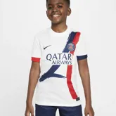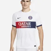 Het Paris Saint Germain uitshirt is overwegend wit en wordt gekenmerkt door het horizontale blok op de borst. Dit blok is in stijl van de clubkleuren van ''PSG''. De rechterkant is rood en de andere kant is blauw. Middels een prisma effect lopen deze kleuren in elkaar over, zoals de iconische lichten van de stad Parijs overgaan in de sterrenhemel. In het vlak is het logo van hoofdsponsor Qatar Airways in het wit verwerkt. De band aan de onderkant van de mouwen is blauw en hetzelfde geldt voor de swoosh van Nike op de rechterborst en het logo van GOAT op de linkermouw. De linkerborst bevat traditiegetrouw het clublogo van de Franse kampioen. Het Paris Saint Germain uitshirt heeft verder alle kenmerken van het nieuwe Nike template. Het voetbalshirt bevat een ronde hals met daaronder een ronding. De achterkant van het voetbalshirt bevat ook een donkerblauw vlak en daaronder is een graphic verwerkt in de kleuren van de Franse vlag: blauw/wit/rood. Het Paris Saint Germain uittenue 2023-2024 wordt compleet gemaakt door een volledig wit voetbalbroekje. Op de voetbalbroekjes staan ook de logo's van Nike en de club. De kousen zijn wit en bevatten op het midden een donkerblauwe swoosh.