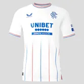 Het Rangers FC uitshirt 2023-2024 werd gelanceerd met het motto: ''The revolution continues''. Dit voetbalshirt is wit en wordt gekenmerkt door de rood/wit/blauwe accenten. De onderkant van het voetbalshirt bevat een design van dunne, verticale rode en blauwe pinstripes. Deze strepen vervagen naar de bovenkant van het voetbalshirt. Ook de ronde hals en de band aan de onderkant van de mouwen zijn rood/wit/blauw. Alle logo's op het uitshirt zijn blauw en deze staan op dezelfde plek als op het thuisshirt. Het Rangers FC uittenue 2023-2024 wordt compleet gemaakt door een blauw voetbalbroekje met een dunne, rode lijn aan de zijkanten. De kousen zijn wit en bevatten ook rode en blauwe details.