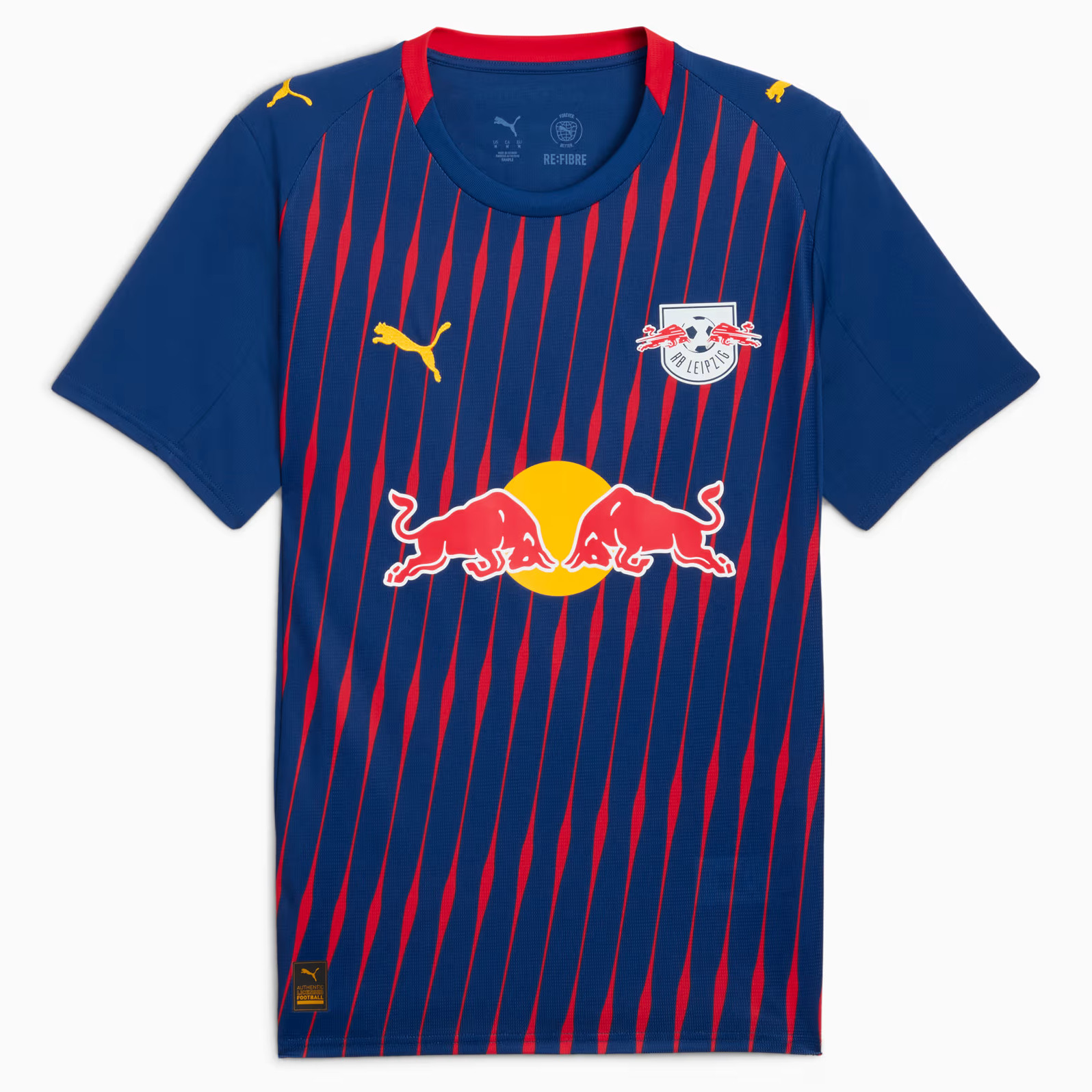 Het RB Leipzig uitshirt 2025-2026 is geïnspireerd door de LED strepen op de zijkanten van de Red Bull Arena, de thuishaven van de Duitse club. Het shirt is donkerblauw en bevat een design van diagonale rode ‘’LED’’ strepen op de body. De strepen symboliseren ook de speelstijl van Red Bull Leipzig: snel, onbevreesd en meedogenloos. De club staat bekend om zijn agressieve pressing en razendsnelle tegenaanvallen! Ook de achterkant van de ronde hals is rood en het Puma logo op de rechterborst en de mouwen is geel. Alle logo’s staan op dezelfde plek als op het thuisshirt. Ditzelfde geldt voor de details op de achterkant. Het RB Leipzig uittenue 2025-2026 wordt compleet gemaakt door een donkerblauw voetbalbroekje met aan de zijkanten een rode band. De sokken van het uittenue zijn blauw met aan de bovenkant een rode band en op het midden in het geel de initialen van de club en het logo van het Duitse sportmerk.