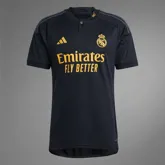 Het Real Madrid 3e voetbalshirt 2023-2024 is donker grijs (charcoal/carbon) met gouden accenten. In tegenstelling tot het nieuwe uitshirt bevat het alternatieve uitshirt geen speciaal patroon op de voorkant van het tenue. Ook op dit voetbalshirt verwijzen de gouden details weer naar de indrukwekkende prijzenkast van ''De Koninklijke''. De club uit de Spaanse hoofdstad werd maar liefst 35 keer kampioen van Spanje, won twintig keer de Copa del Rey, veertien keer de Champions League, twee keer de UEFA Cup en won acht keer de wereldbeker. De gouden accenten komen terug in alle logo's op het nieuwe voetbalshirt. De rechterborst bevat het adidas logo, de linkerborst het clublogo en op het midden van het voetbalshirt staat traditiegetrouw het logo van Emirates Fly Better. Het Real Madrid logo betreft dus een monochroom logo. Het logo heeft namelijk niet de gebruikelijke kleuren, maar is in stijl van de kleuren van het voetbalshirt: goud/donkergrijs. Het voetbalshirt is verder uitgerust met een stijlvolle henley collar met een knoopje. Op de linkerkant van de kraag zijn bovendien de initialen van de club geborduurd: RMCF. Opvallend genoeg zijn de adidas trademark strepen op de schouders in stijl van de kleur van het voetbalshirt, waardoor deze bijna niet zichtbaar zijn. De strepen zijn namelijk ook grijs.
