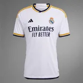 Het Real Madrid thuisshirt 2023-2024 is natuurlijk weer maagdelijk wit en, wellicht om de spelers te motiveren, heeft adidas gouden accenten aan het voetbalshirt toegevoegd. De laatste keer dat het thuistenue van de ''Koninklijke'' gouden details had, was tijdens het seizoen 2011-2012. Dit seizoen bevat het voetbalshirt niet alleen gouden details, maar ook navy blauwe accenten. Deze kleurencombinatie komt terug in de twee lijnen van de geribbelde, ronde hals en in de band aan de onderkant van de mouwen. De adidas strepen staan op de schouders van het voetbalshirt en zijn ook goud. Het Real Madrid thuisshirt is dit seizoen ook uitgerust met een subtiele all-over print, die het elegante karakter van de club symboliseert. Alle logo's staan op de gebruikelijke plekken. De rechterborst bevat het nieuwe adidas performance logo. Dit logo wordt ook wel het 3BAR logo genoemd en bestaat alleen nog maar uit de drie diagonale blokken. Dit logo staat vanaf dit seizoen op alle adidas voetbalshirts en is op het Real Madrid thuisshirt donkerblauw. De andere borst is uitgerust met het officiële clublogo en op het midden van het tenue staat het logo van Emirates Fly Better in het navy blauw. De zijkanten van het voetbalshirt bevatten een donkerblauwe baan, welke doorloopt naar de onderkant van de achterzijde van het nieuwe Real Madrid voetbalshirt. Een speciaal detail bevindt zich op de achterkant van de hals. Hier staat het motto van de club: ''¡Hala Madrid!”