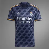 Hoewel de kleur van het Real Madrid uitshirt 2023-2024 doet denken aan het populaire uitshirt van de periode 1999-2001, is het uitshirt geïnspireerd door de ziel van de club! Het voetbalshirt is marineblauw en bevat een all-over print van het infinity teken, welke in golven op het voetbalshirt verwerkt is. Het symbool van oneindigheid is voor Real Madrid ook een teken van dank voor de liefde en de onvoorwaardelijke steun die het krijgt van de supporters. In het ''infitiny'' patroon is ook een special effect verwerkt. De adidas trademark strepen op de schouders hebben drie verschillende kleuren, die onlosmakelijk aan de club verbonden zijn. De witte lijn is natuurlijk geïnspireerd door de kleur van het thuisshirt, de paarse lijn verwijst naar de kleur van verschillende uitshirts in de historie van de club uit de Spaanse hoofdstad en de gouden lijn is een ode aan de indrukwekkende prijzenkast van Real Madrid Club de Fútbol! Ook aan de onderkant van de mouwen bevindt zich een gouden lijn. Alle sponsorlogo's op het Real Madrid uitshirt zijn wit. De rechterborst bevat het nieuwe adidas 3BAR logo en op het midden van het uitshirt staat het logo van Emirates Fly Better in het wit. Op de linkerborst prijkt traditiegetrouw het clublogo! Dit seizoen heeft het uitshirt een ronde hals.