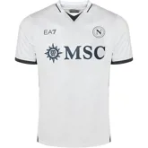 Het Napoli uitshirt 2024-2025 heeft hetzelfde template als het thuisshirt, maar dan in een andere kleurencombinatie. Het uitshirt is wit en bevat navy blauwe details. Deze kleuren komen terug in de v-hals en de lijn in de polokraag. Ook de taping op de zijkanten van het voetbalshirt en de band aan de onderkant van de mouwen zijn navy blauw. Hetzelfde geldt voor alle logo’s, welke op dezelfde plek staan als op het thuisshirt. Ook dit shirt bevat een repeterende tone-on-tone print van het clublogo, verbonden door golven, verwijzend naar de Golf van Napels. Het voetbalbroekje en de sokken hebben dezelfde kleurencombinatie als het voetbalshirt.